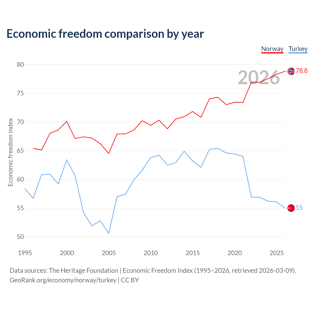 The Economic Freedom Index for Norway is 78.8, ranking 9/197, compared to 55 for Turkey, ranking 129/197. The chart above displays a comparison of annual changes in economic freedom indexes.