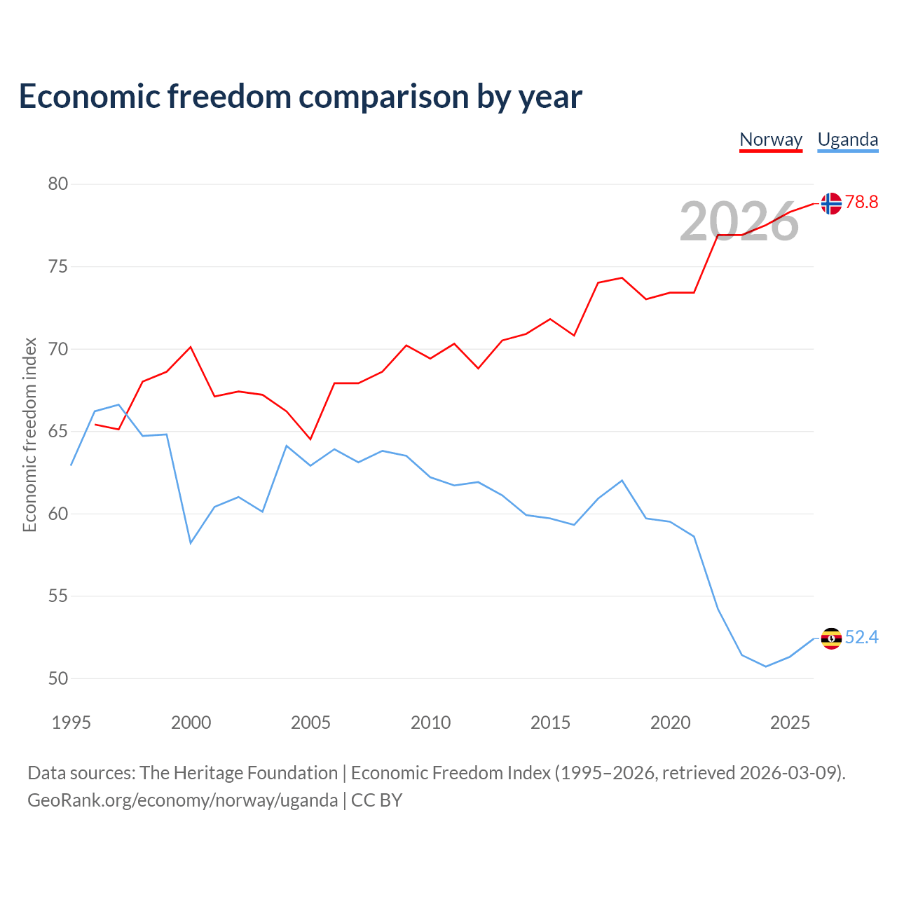 The Economic Freedom Index for Norway is 78.8, ranking 9/197, compared to 52.4 for Uganda, ranking 149/197. The chart above displays a comparison of annual changes in economic freedom indexes.
