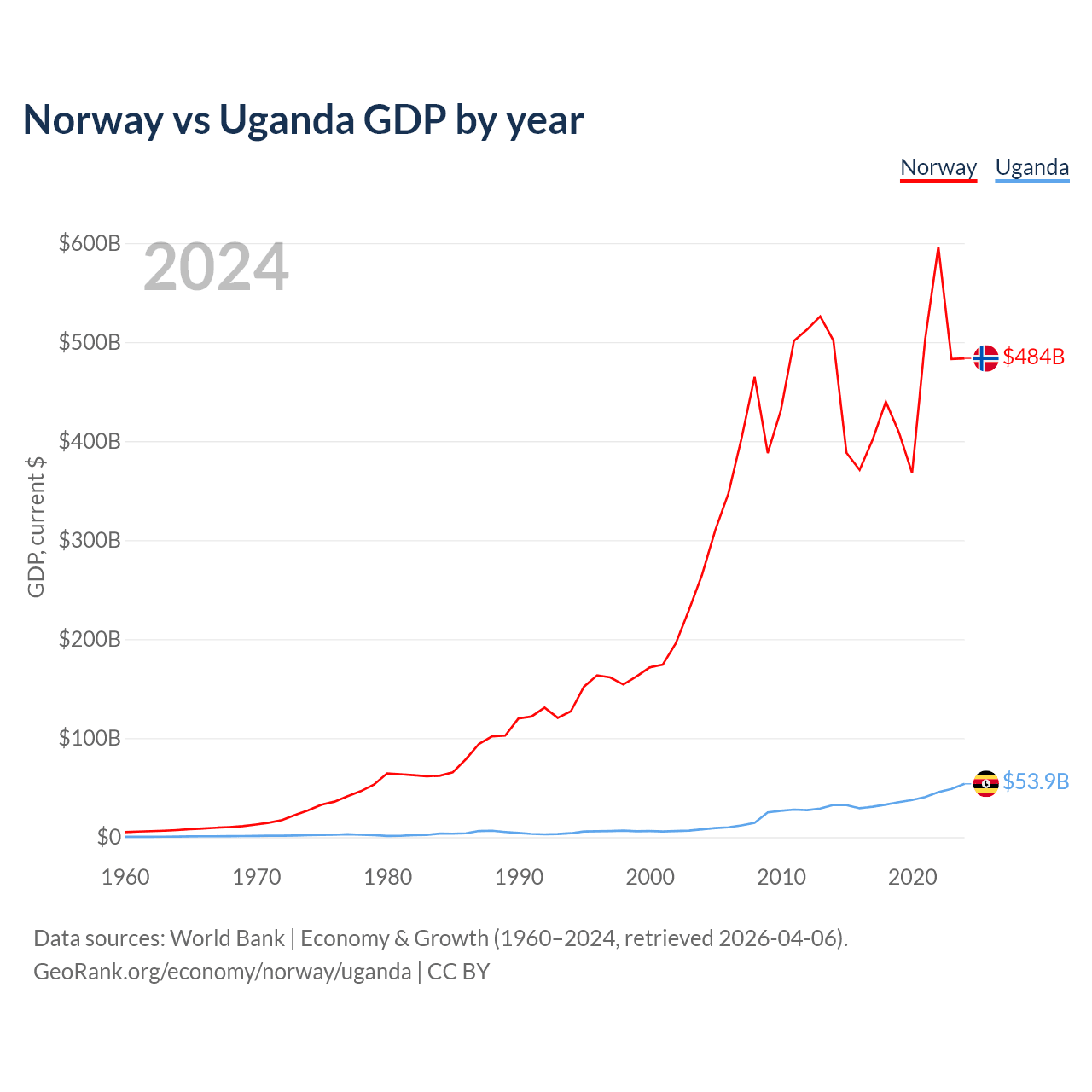 Norway vs Uganda GDP by year