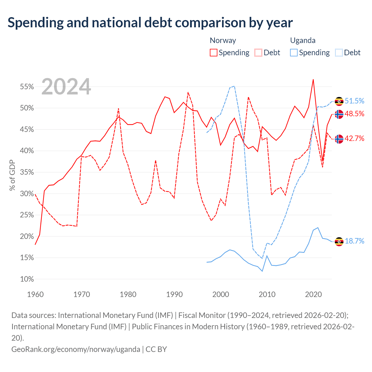 Norway has $207B in government debt (42.7% of GDP), compared to $27.8B (51.5% of GDP) in Uganda.