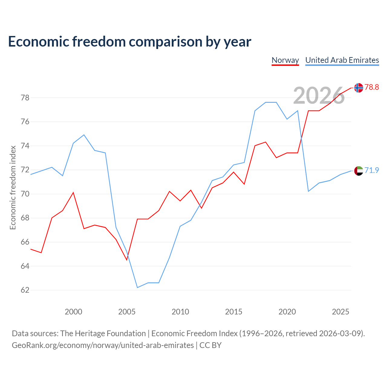 The Economic Freedom Index for Norway is 78.8, ranking 9/197, compared to 71.9 for the United Arab Emirates, ranking 29/197. The chart above displays a comparison of annual changes in economic freedom indexes.