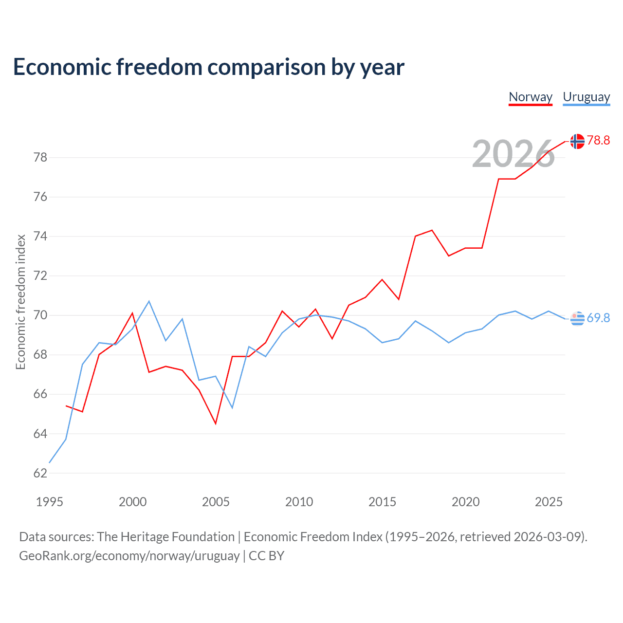 The Economic Freedom Index for Norway is 78.8, ranking 9/197, compared to 69.8 for Uruguay, ranking 39/197. The chart above displays a comparison of annual changes in economic freedom indexes.