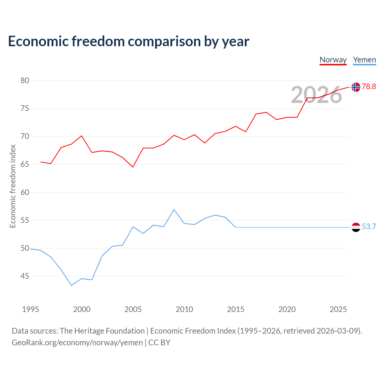 The Economic Freedom Index for Norway is 78.8, ranking 9/197, compared to 53.7 for Yemen, ranking 138/197. The chart above displays a comparison of annual changes in economic freedom indexes.