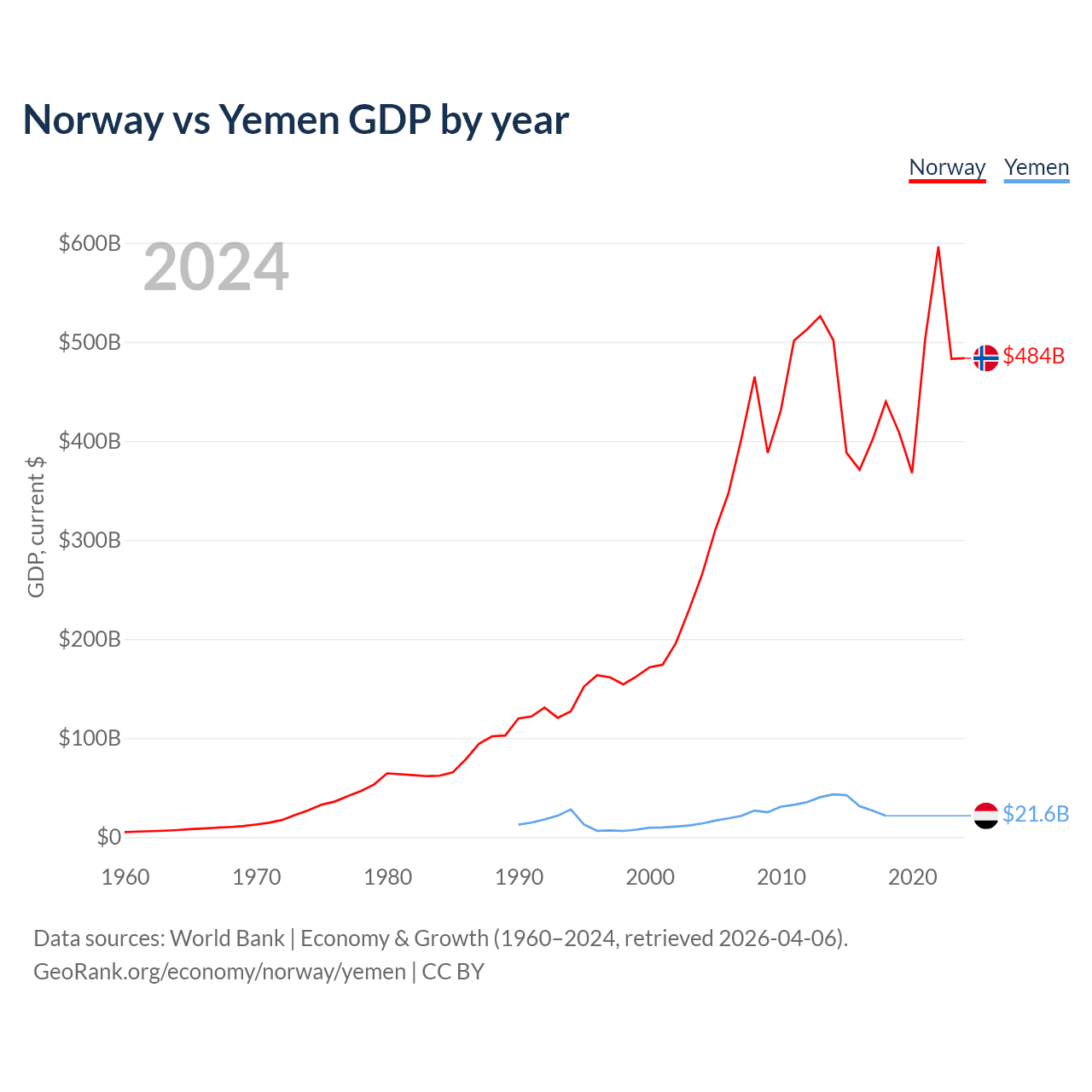 Norway has a GDP of $484B compared to $21.6B for Yemen, ranking 32/197 and 125/197 by economy size, respectively.