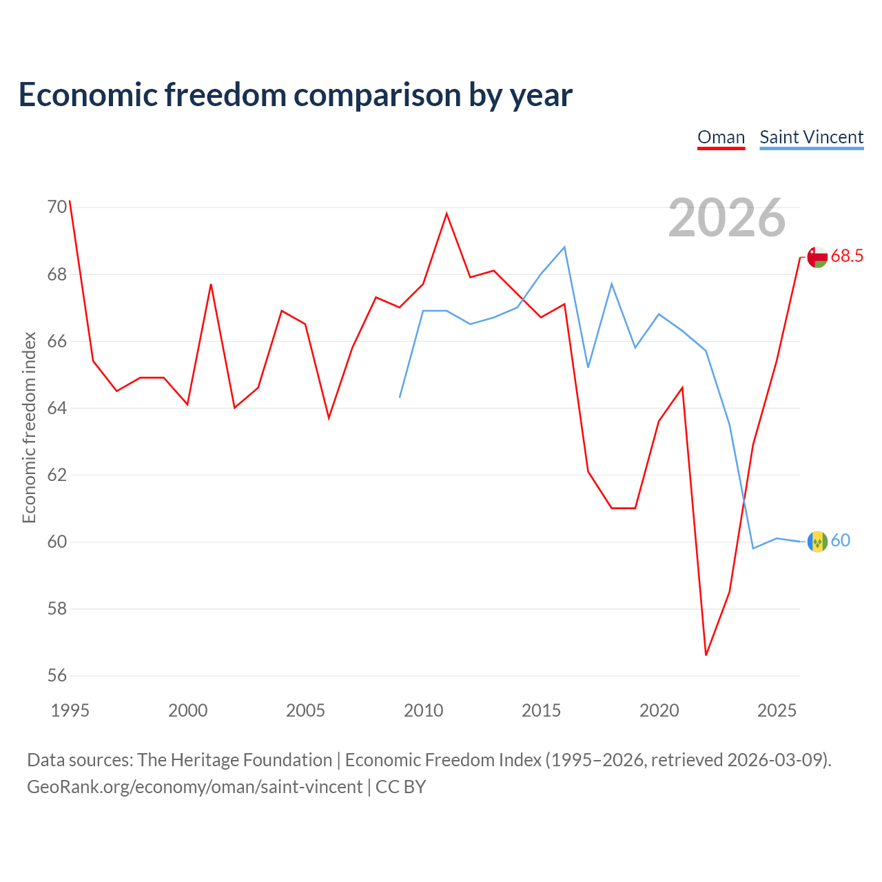 The Economic Freedom Index for Oman is 68.5, ranking 45/197, compared to 60 for Saint Vincent, ranking 98/197. The chart above displays a comparison of annual changes in economic freedom indexes.