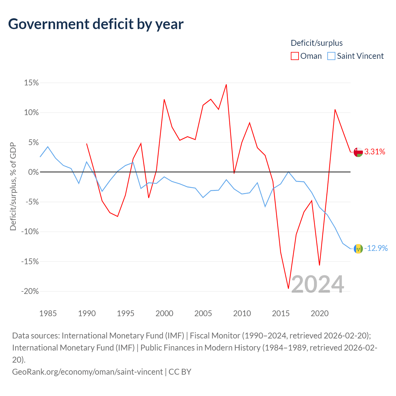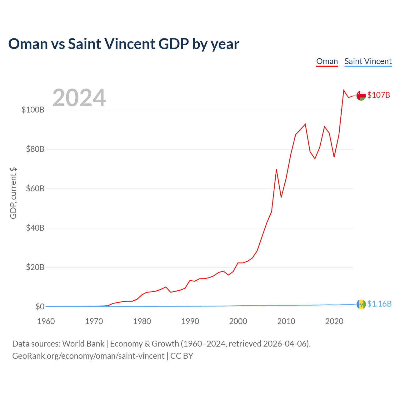 Oman has a GDP of $107B compared to $1.16B for Saint Vincent, ranking 70/197 and 186/197 by economy size, respectively.