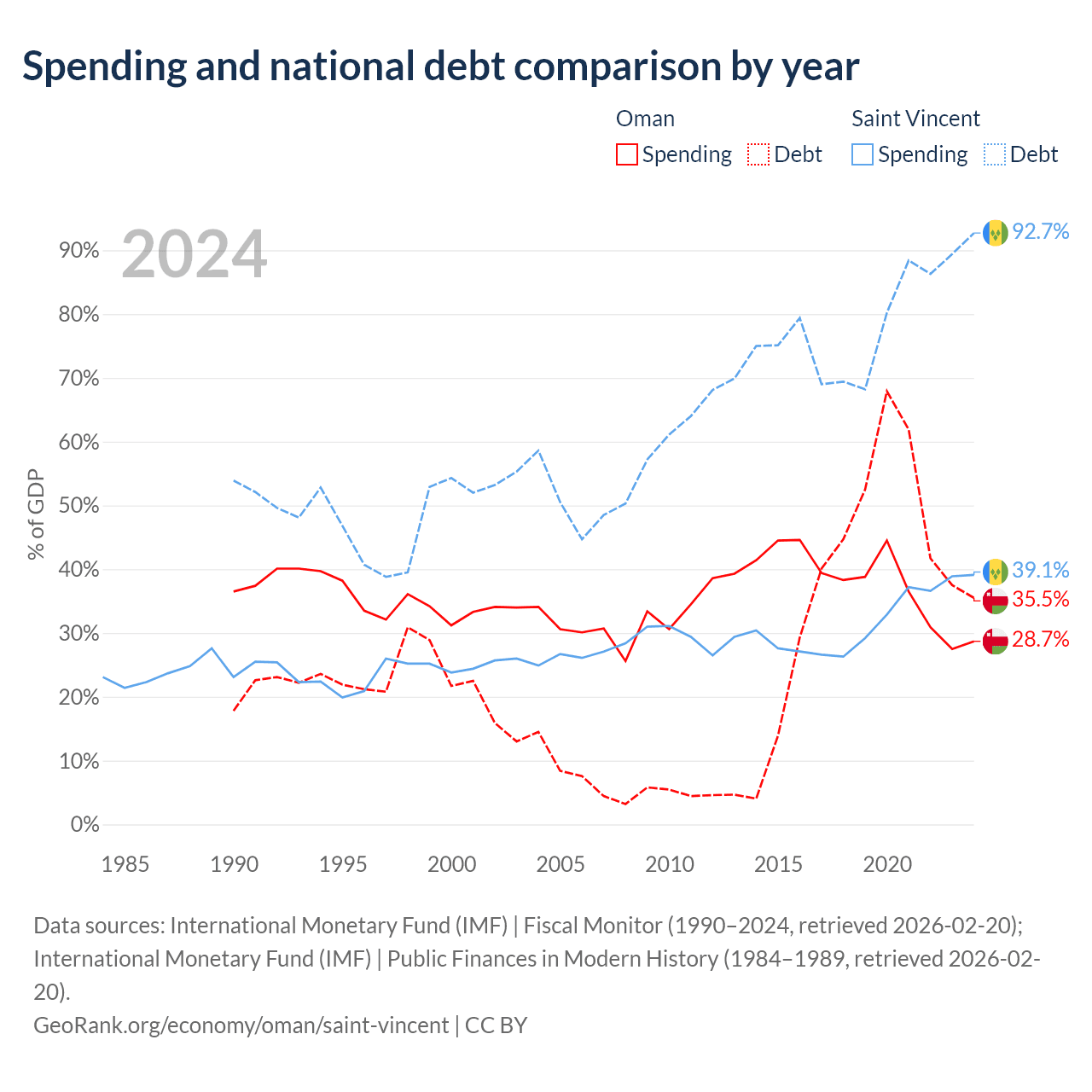 Oman has $38B in government debt (35.5% of GDP), compared to $1.07B (92.7% of GDP) in Saint Vincent.