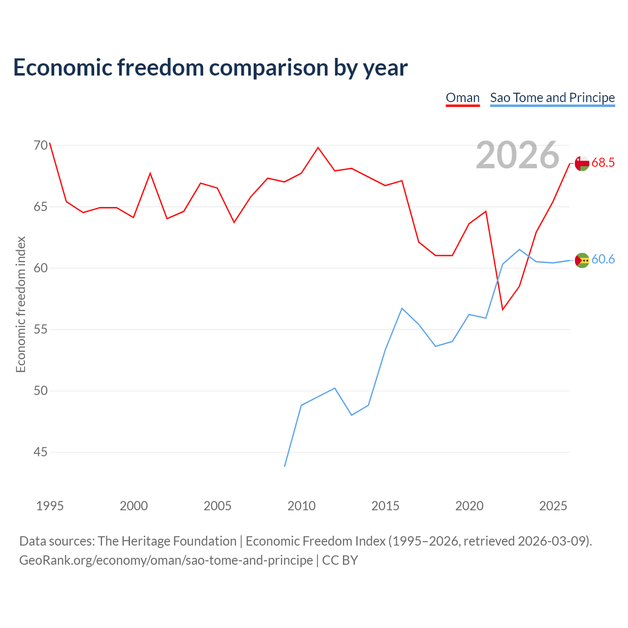 The Economic Freedom Index for Oman is 68.5, ranking 45/197, compared to 60.6 for Sao Tome and Principe, ranking 93/197. The chart above displays a comparison of annual changes in economic freedom indexes.