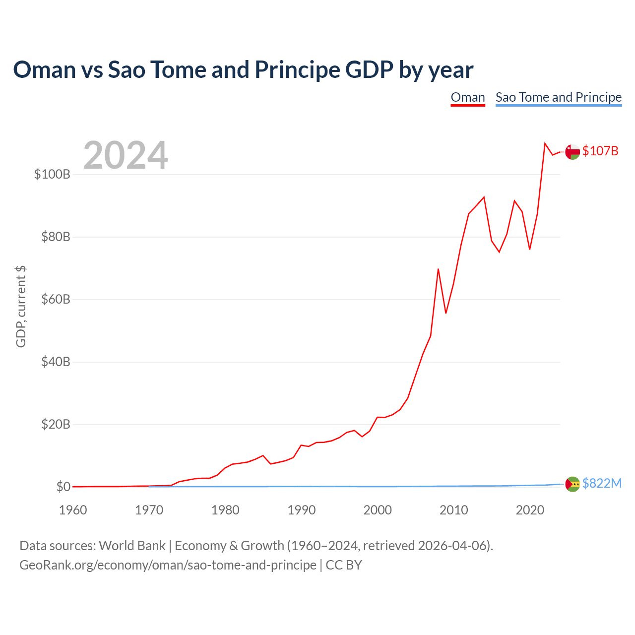Oman has a GDP of $107B compared to $822M for Sao Tome and Principe, ranking 70/197 and 189/197 by economy size, respectively.