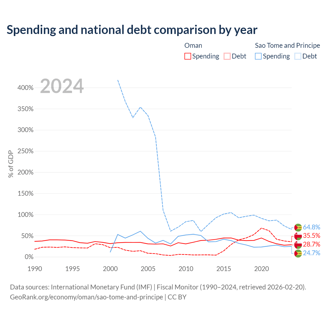 Oman has $38B in government debt (35.5% of GDP), compared to $533M (64.8% of GDP) in Sao Tome and Principe.
