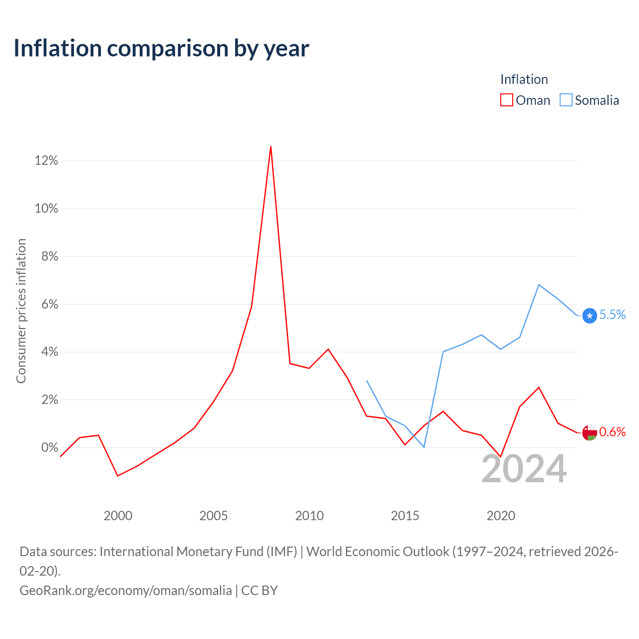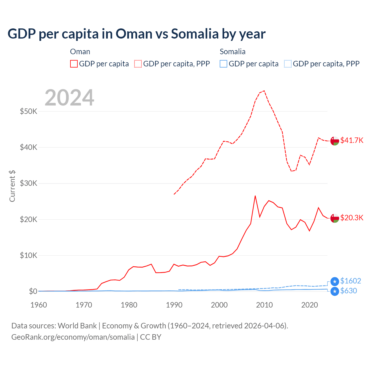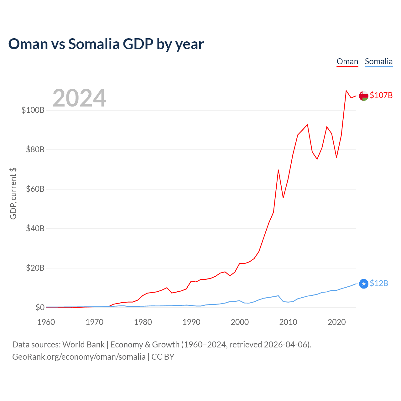 Oman has a GDP of $107B compared to $12B for Somalia, ranking 70/197 and 150/197 by economy size, respectively.
