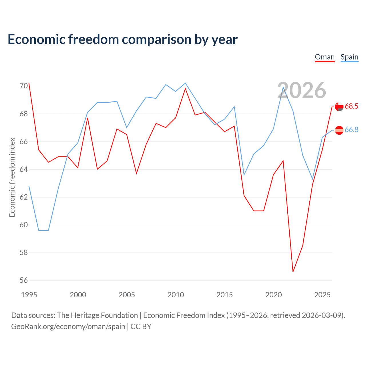 Data sources: The Heritage Foundation | Economic Freedom Index (1995–2026, retrieved 2026-03-09).