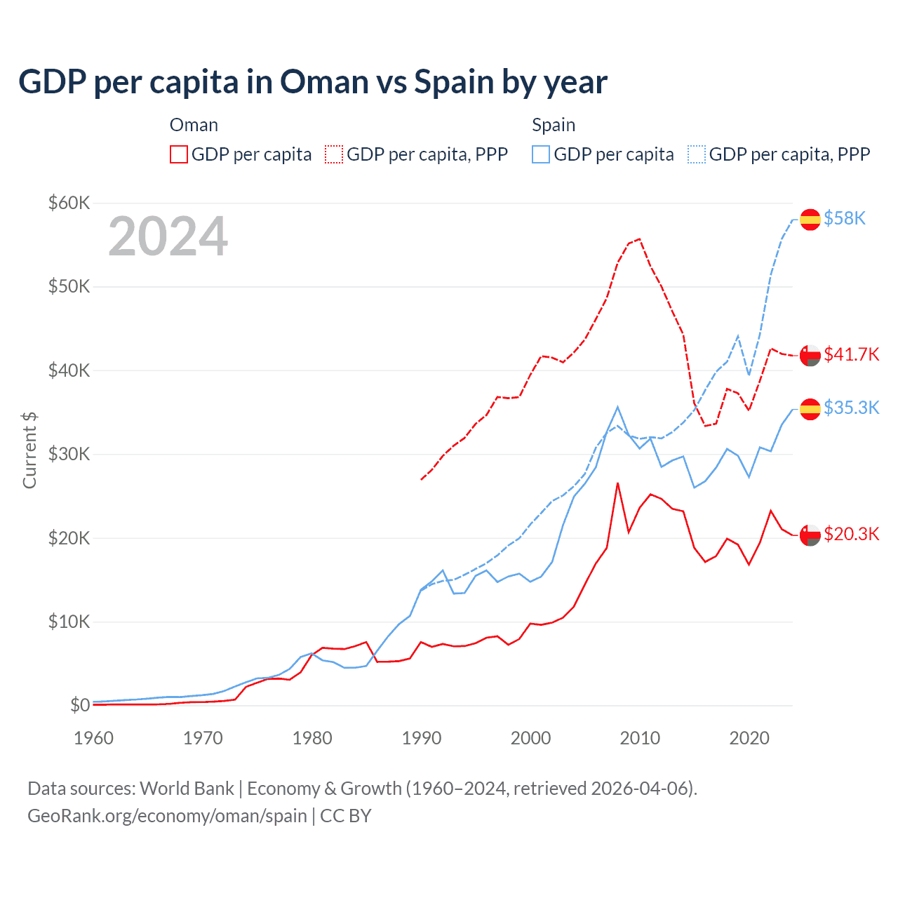 GDP per capita in Oman vs Spain by year