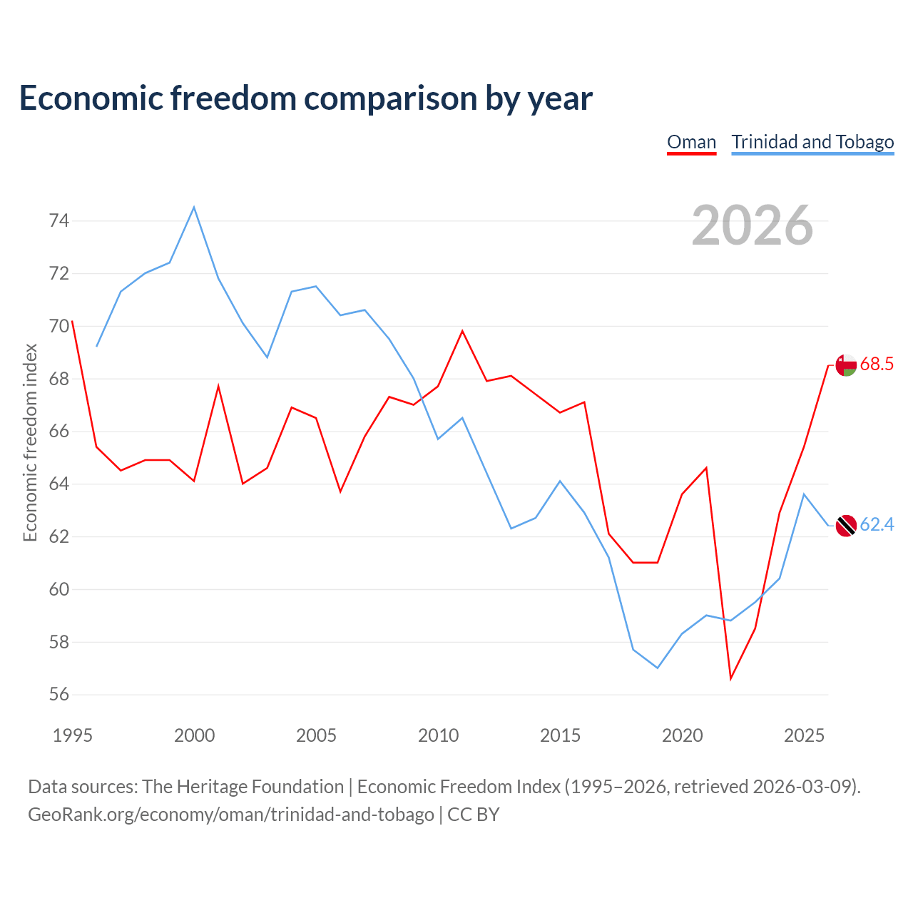 The Economic Freedom Index for Oman is 68.5, ranking 45/197, compared to 62.4 for Trinidad and Tobago, ranking 87/197. The chart above displays a comparison of annual changes in economic freedom indexes.