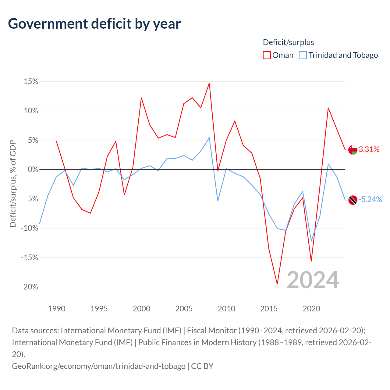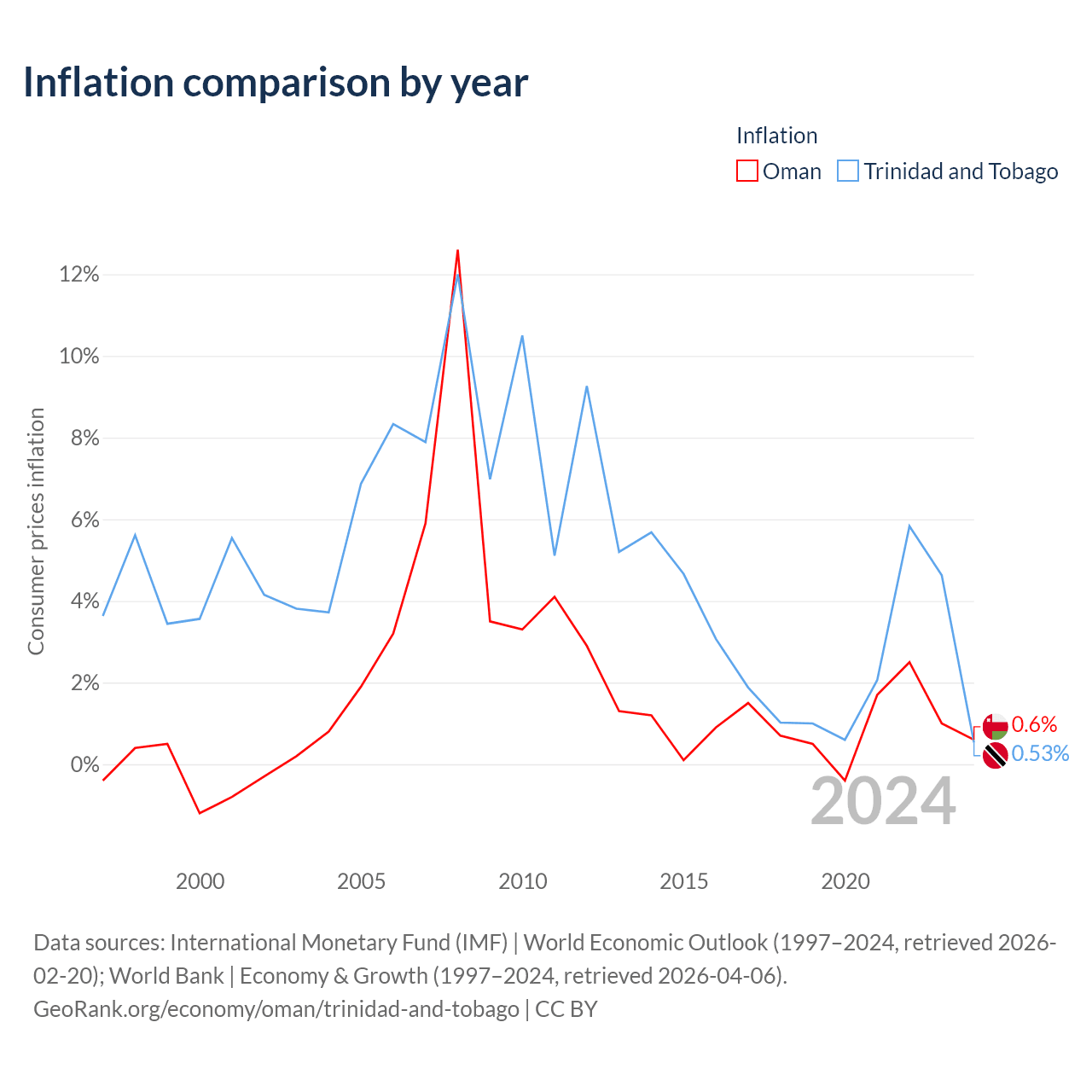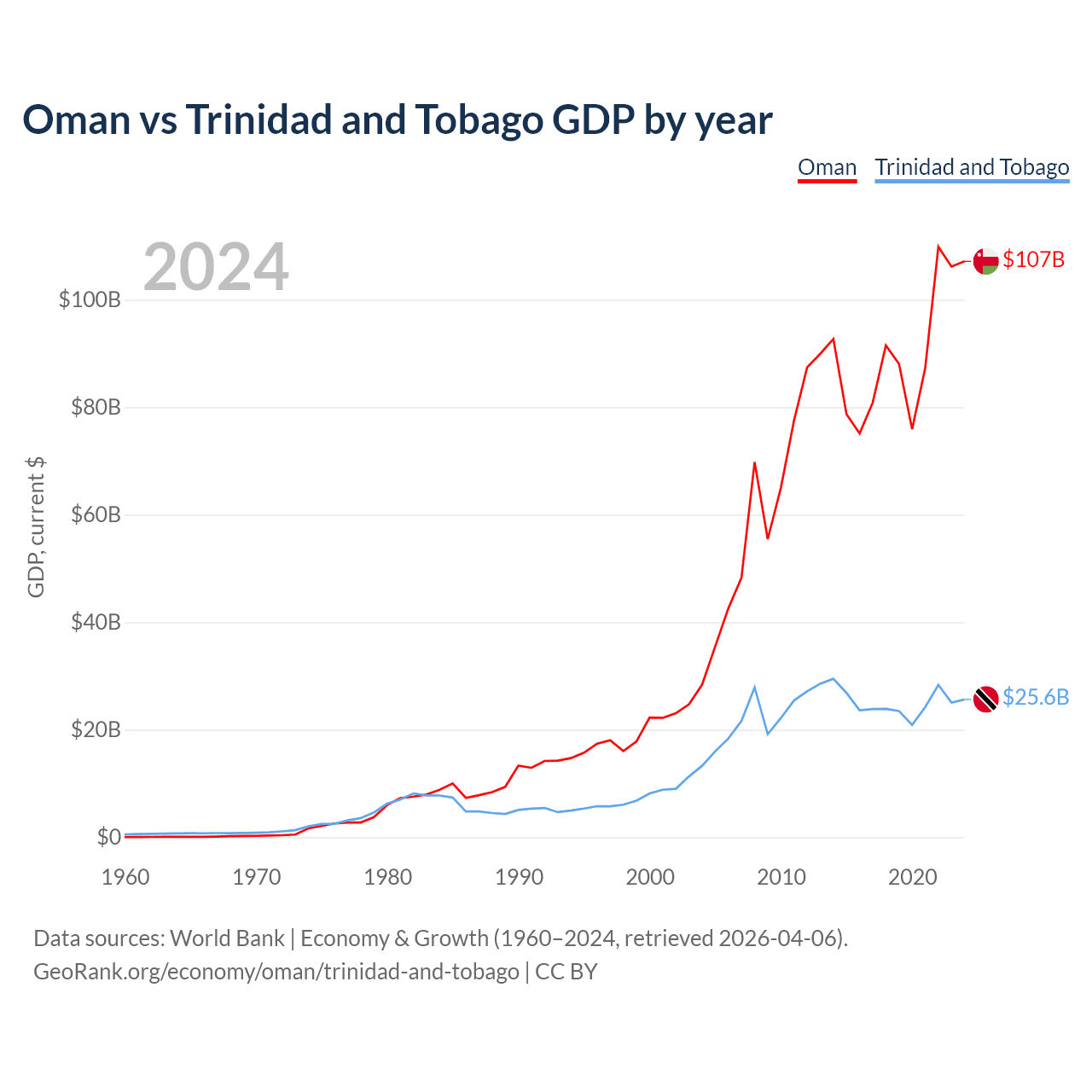 Oman has a GDP of $107B compared to $25.6B for Trinidad and Tobago, ranking 70/197 and 115/197 by economy size, respectively.
