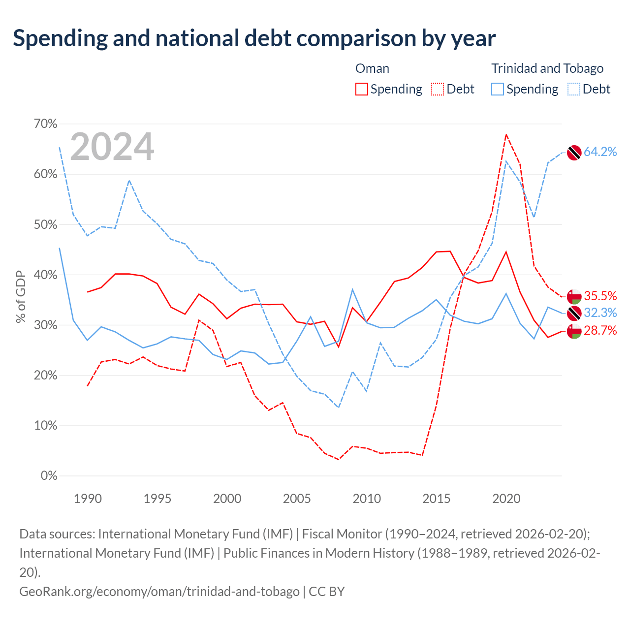 Oman has $38B in government debt (35.5% of GDP), compared to $16.5B (64.2% of GDP) in Trinidad and Tobago.