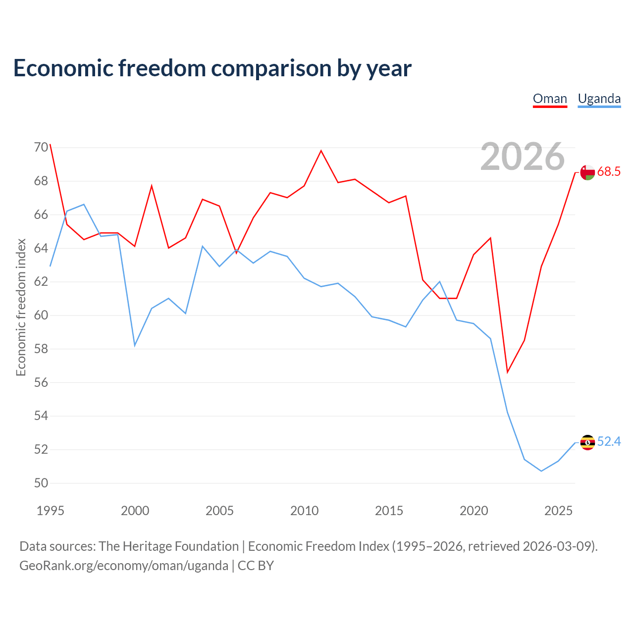 The Economic Freedom Index for Oman is 68.5, ranking 45/197, compared to 52.4 for Uganda, ranking 149/197. The chart above displays a comparison of annual changes in economic freedom indexes.