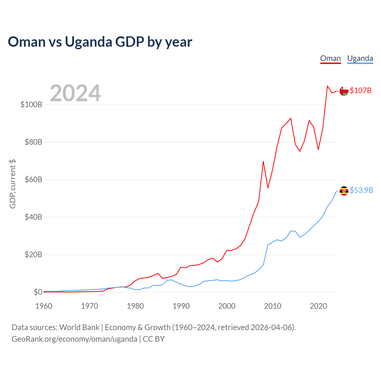 Oman has a GDP of $107B compared to $53.9B for Uganda, ranking 70/197 and 89/197 by economy size, respectively.