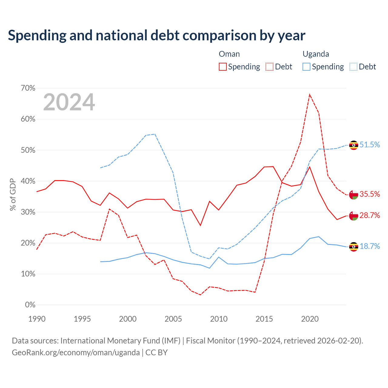 Oman has $38B in government debt (35.5% of GDP), compared to $27.8B (51.5% of GDP) in Uganda.