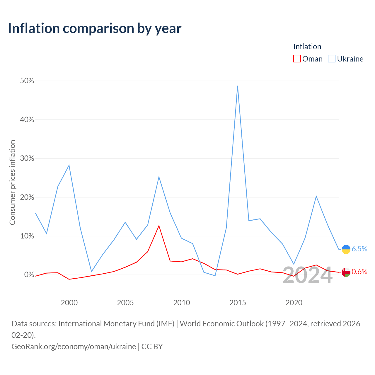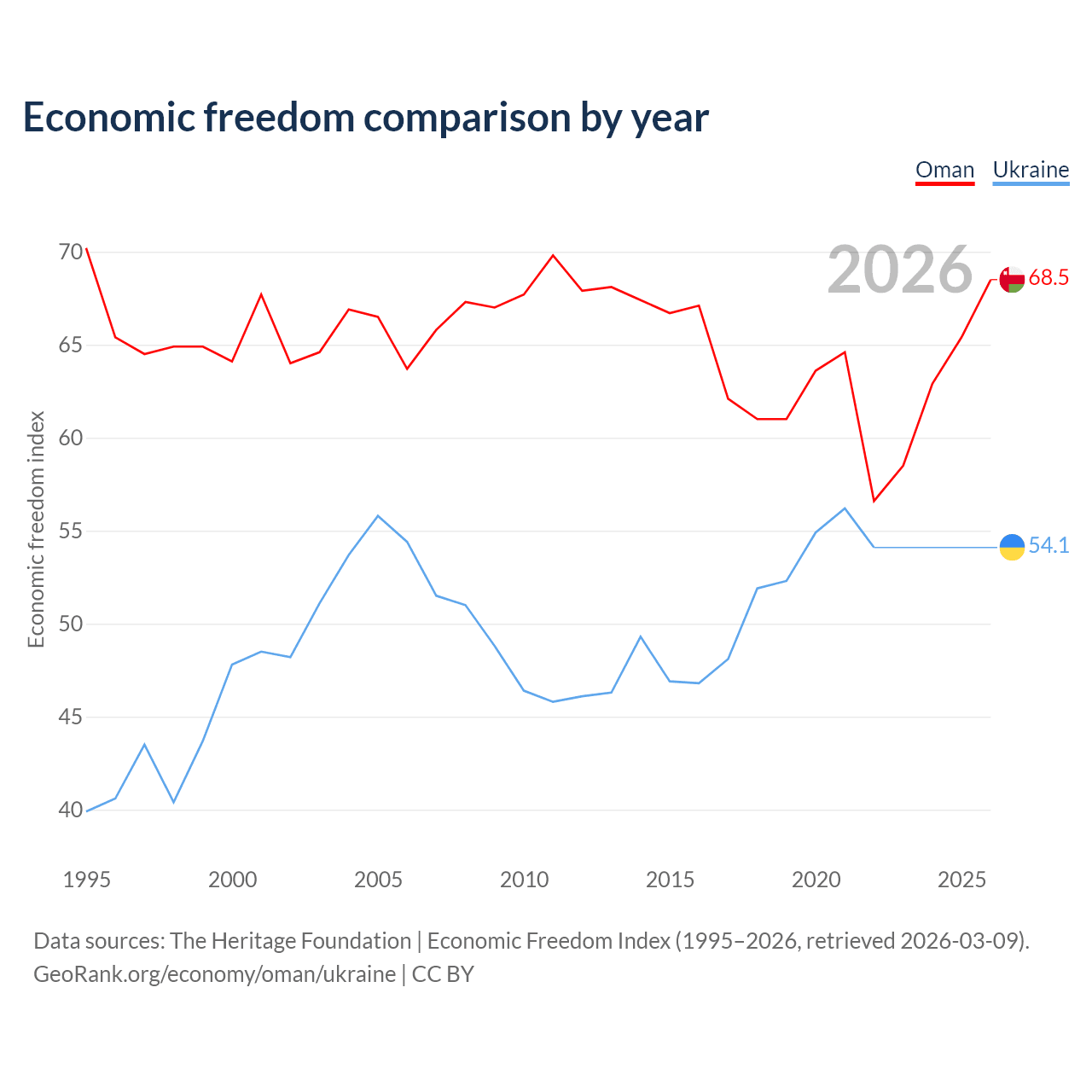 The Economic Freedom Index for Oman is 68.5, ranking 45/197, compared to 54.1 for Ukraine, ranking 135/197. The chart above displays a comparison of annual changes in economic freedom indexes.
