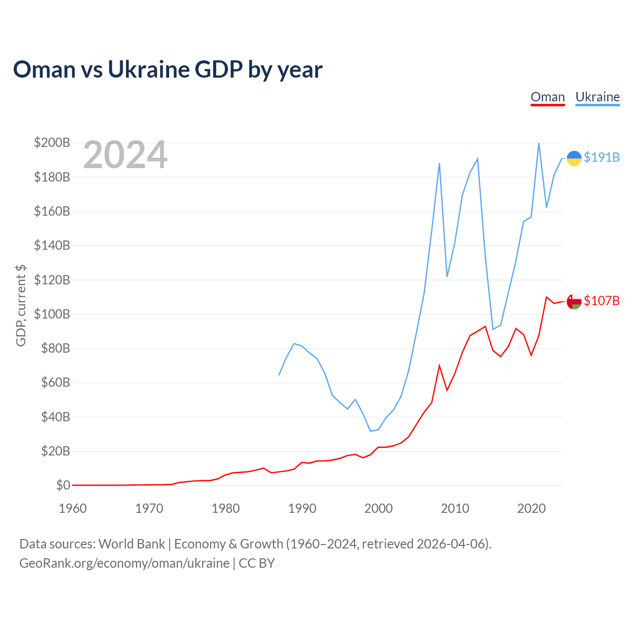 Oman has a GDP of $107B compared to $191B for Ukraine, ranking 70/197 and 57/197 by economy size, respectively.