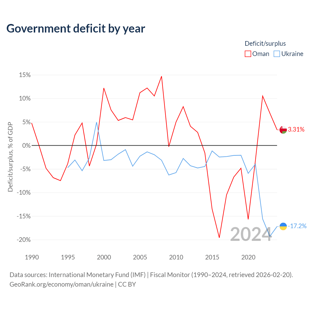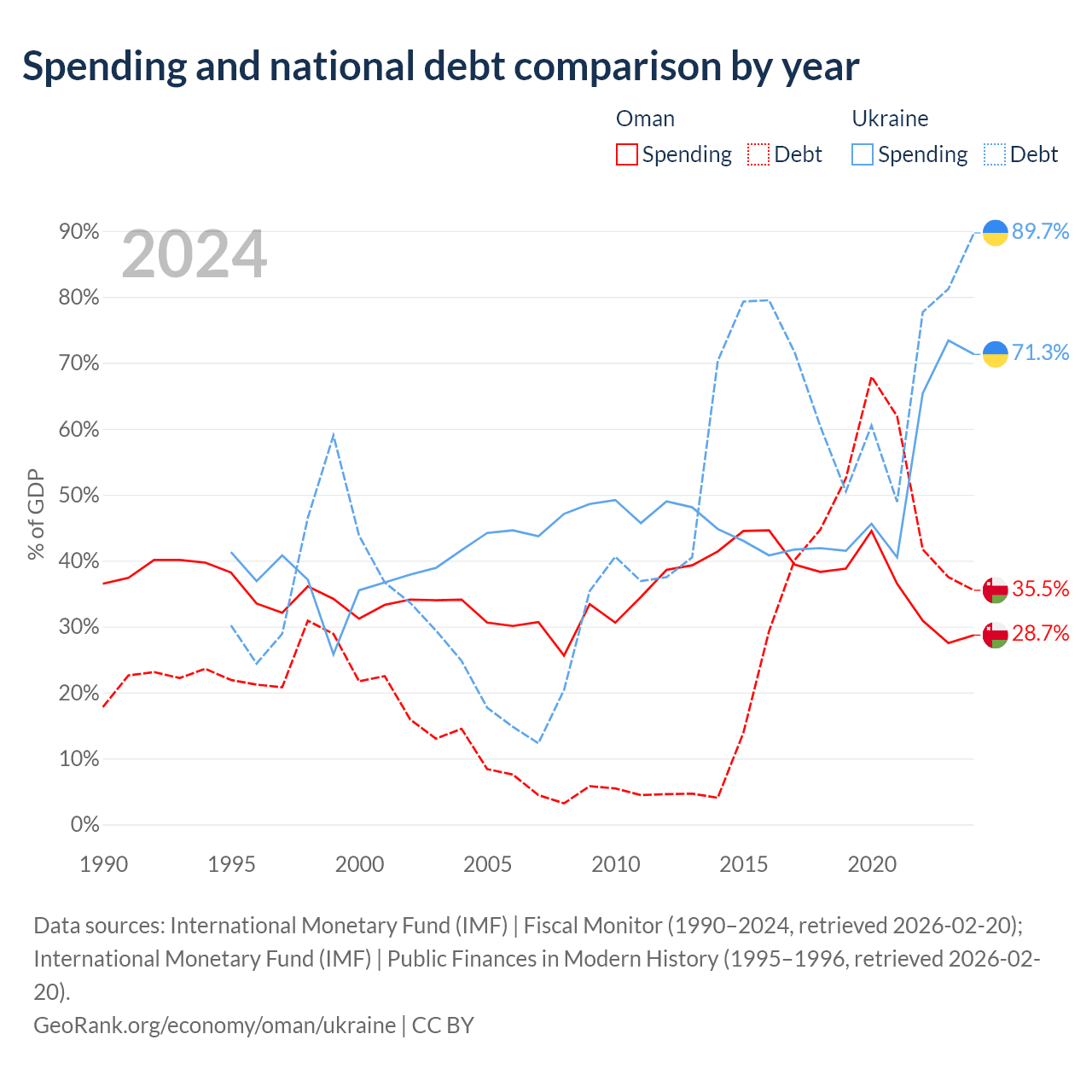 Oman has $38B in government debt (35.5% of GDP), compared to $171B (89.7% of GDP) in Ukraine.