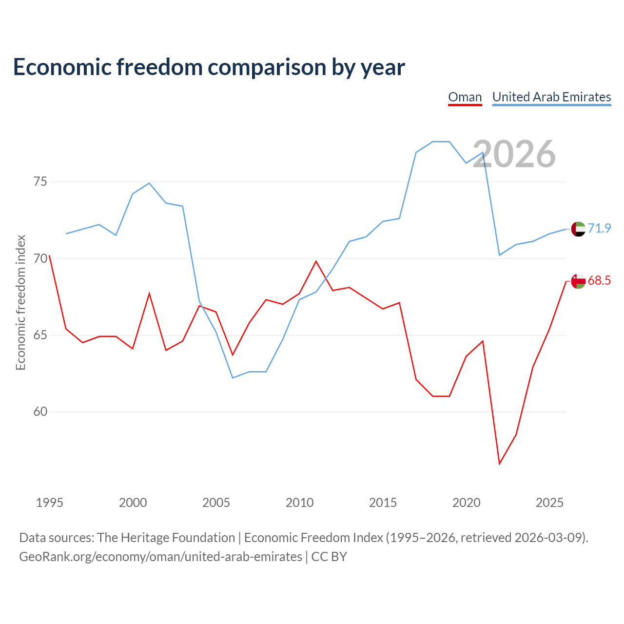 The Economic Freedom Index for Oman is 68.5, ranking 45/197, compared to 71.9 for the United Arab Emirates, ranking 29/197. The chart above displays a comparison of annual changes in economic freedom indexes.