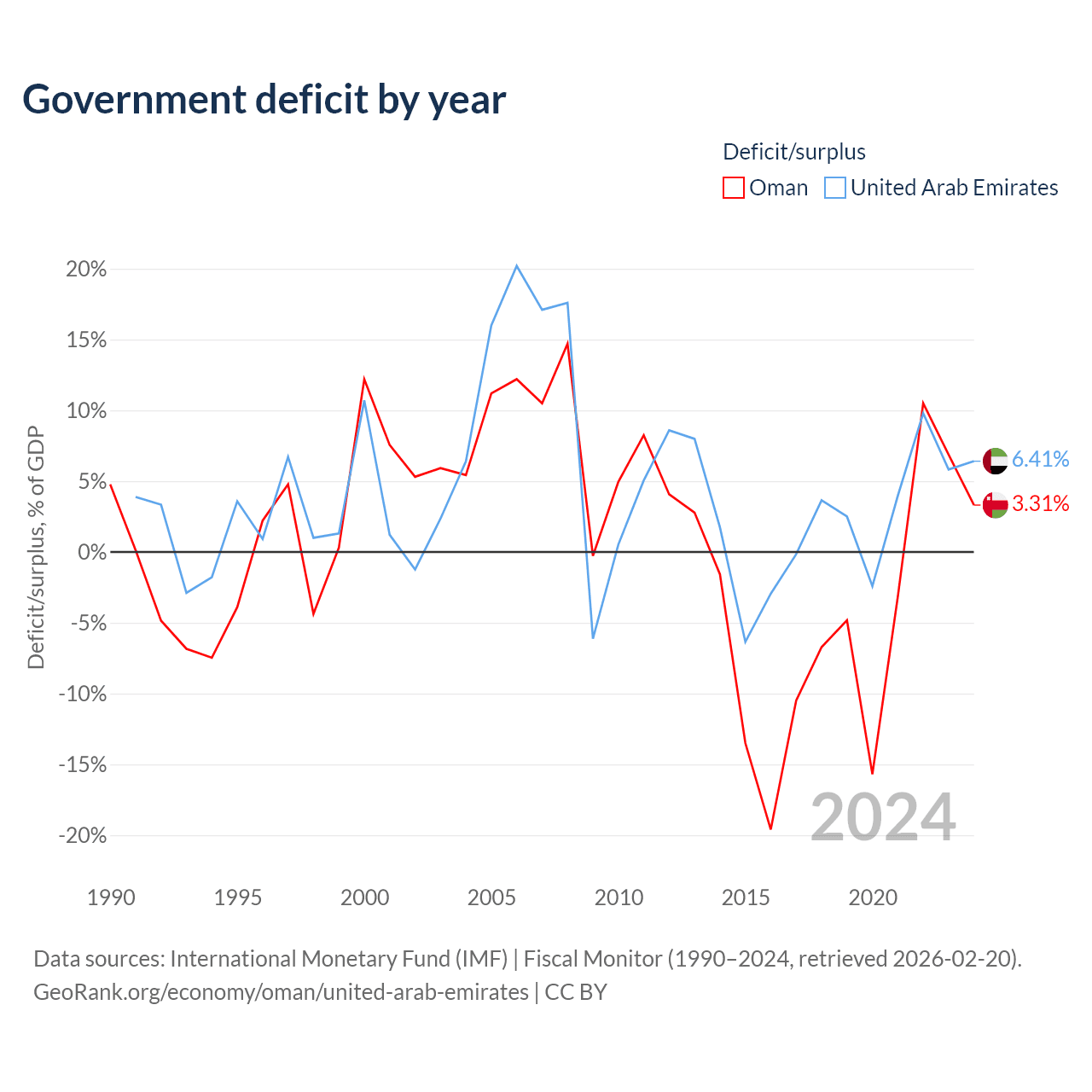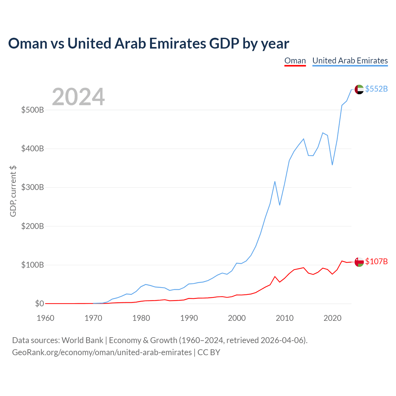 Oman has a GDP of $107B compared to $552B for the United Arab Emirates, ranking 70/197 and 27/197 by economy size, respectively.