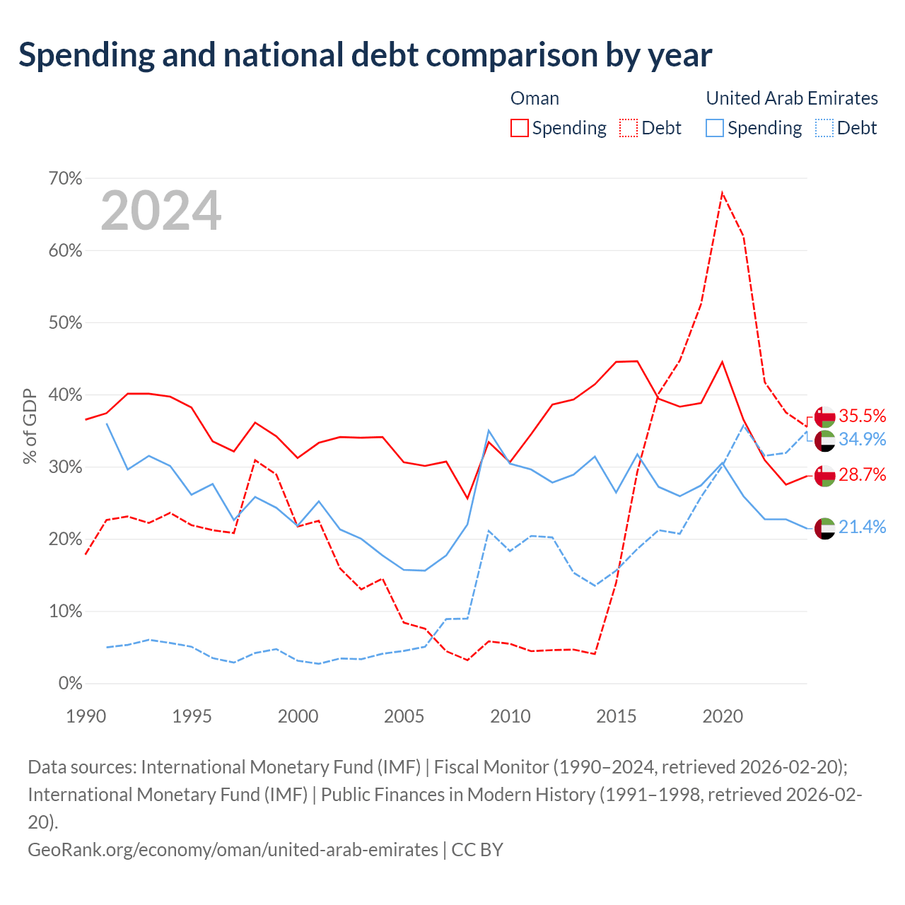 Oman has $38B in government debt (35.5% of GDP), compared to $193B (34.9% of GDP) in the United Arab Emirates.