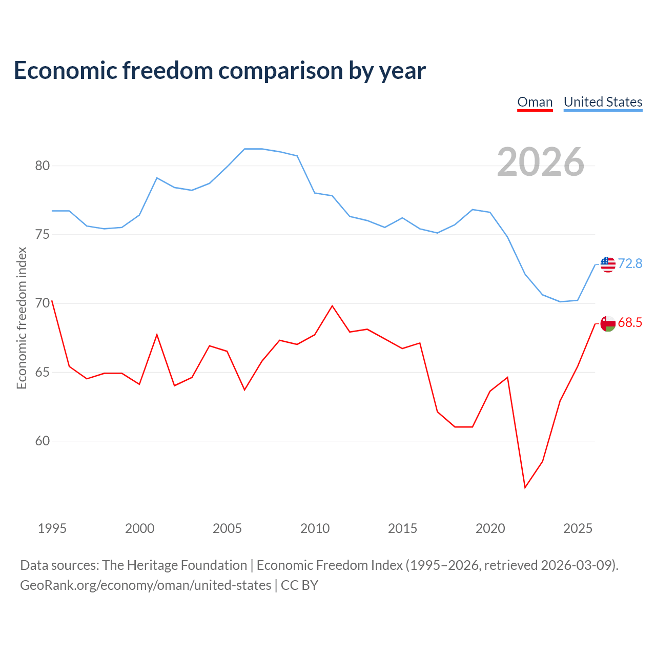 Data sources: The Heritage Foundation | Economic Freedom Index (1995–2026, retrieved 2026-03-09).