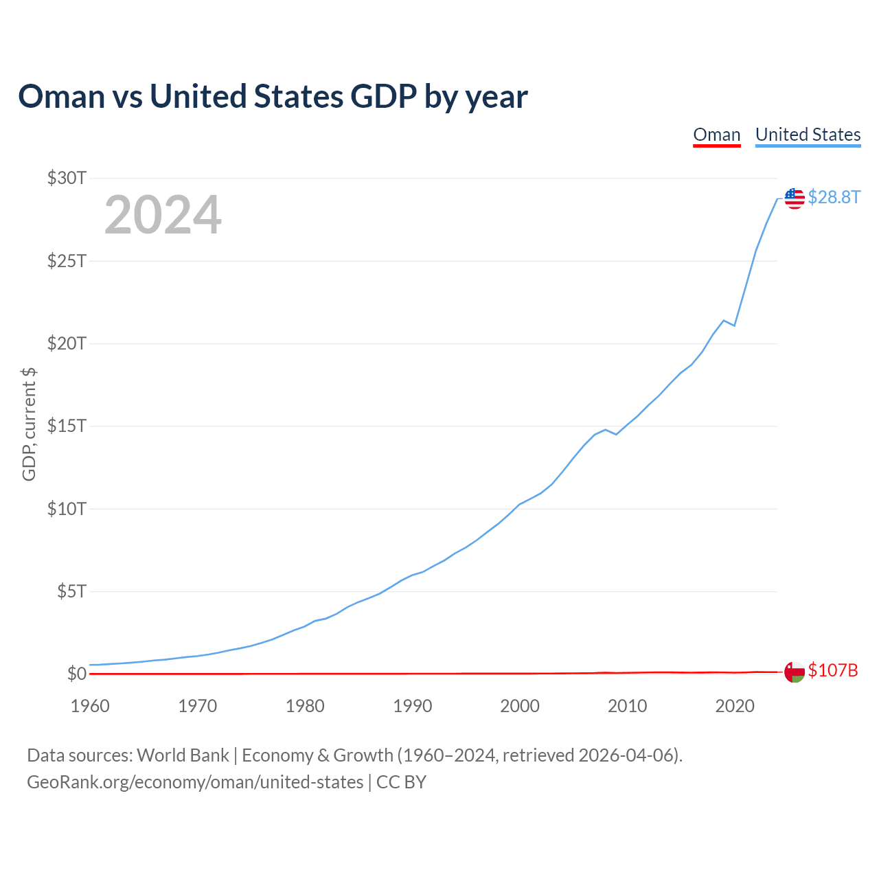 Oman has a GDP of $107B compared to $28.8T for the United States, ranking 70/197 and 1/197 by economy size, respectively.