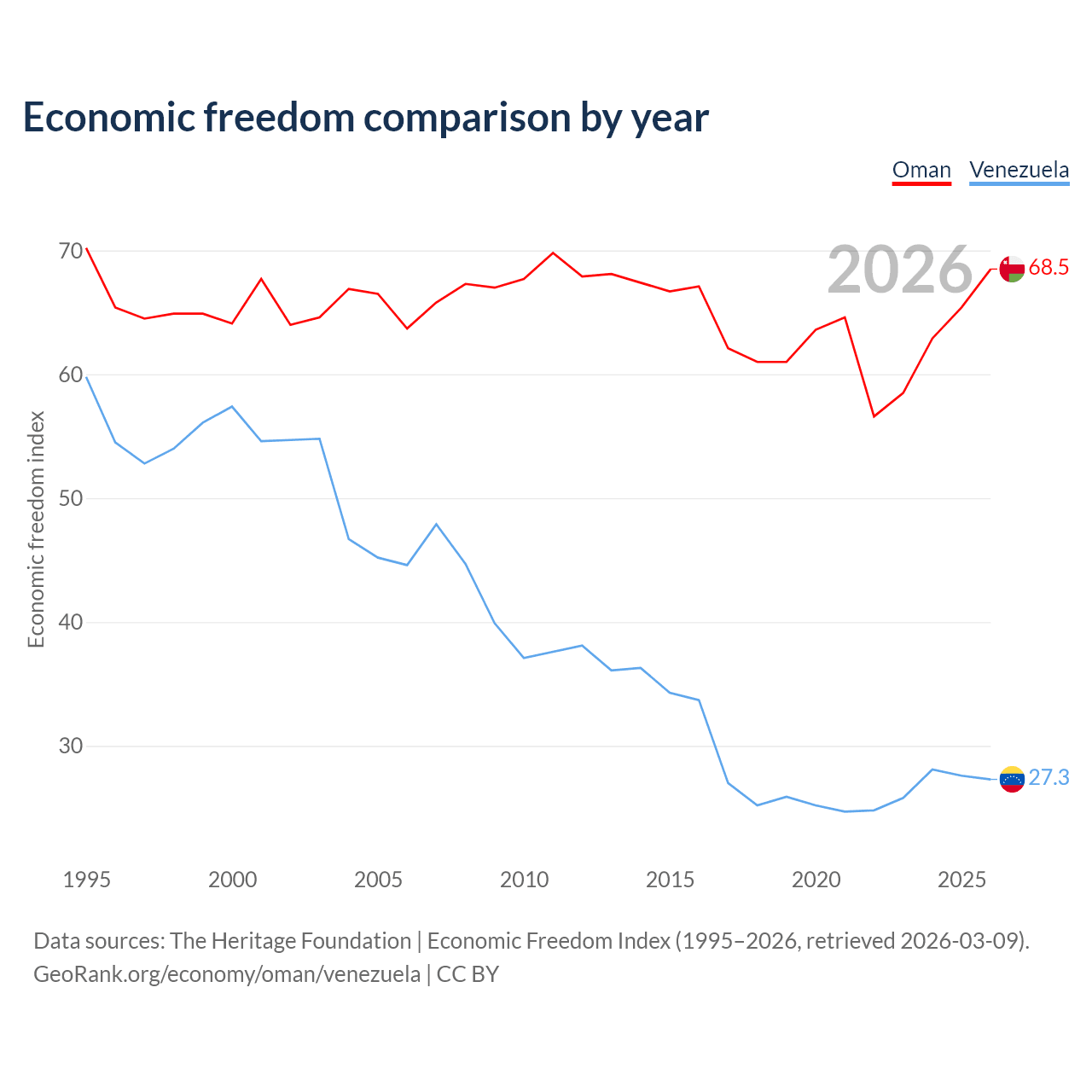 The Economic Freedom Index for Oman is 68.5, ranking 45/197, compared to 27.3 for Venezuela, ranking 194/197. The chart above displays a comparison of annual changes in economic freedom indexes.