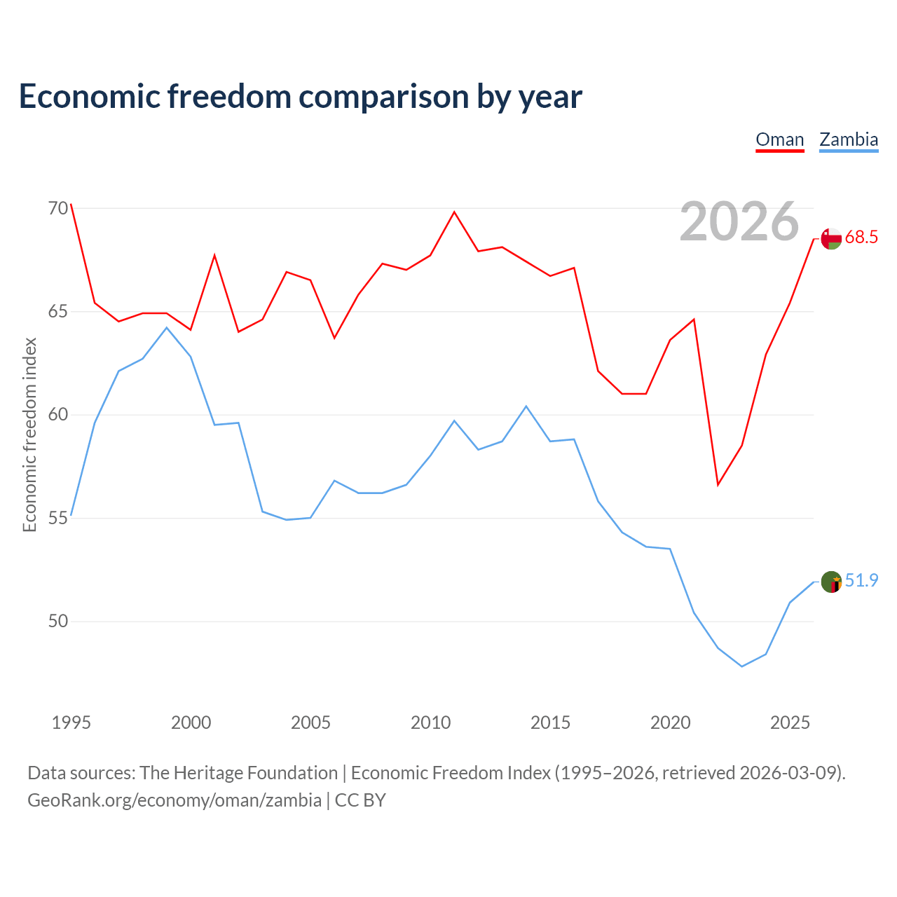 The Economic Freedom Index for Oman is 68.5, ranking 45/197, compared to 51.9 for Zambia, ranking 152/197. The chart above displays a comparison of annual changes in economic freedom indexes.