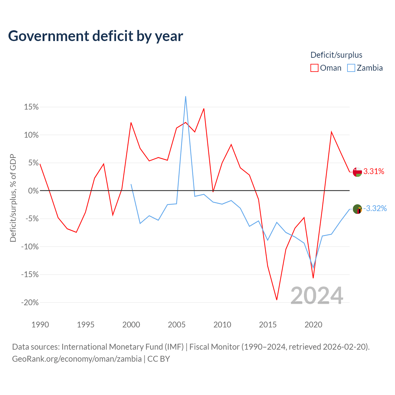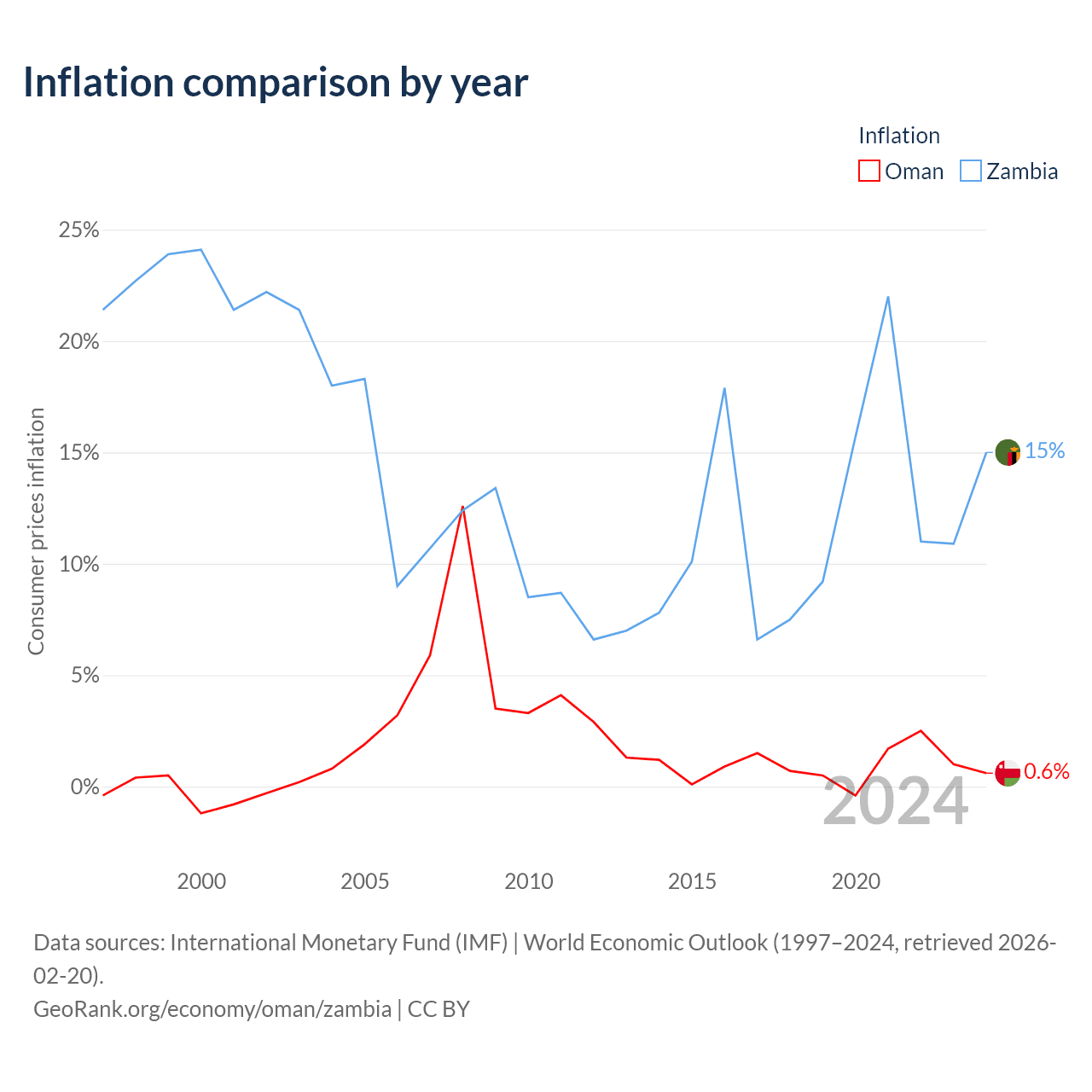 Oman has a GDP of $107B compared to $25.3B for Zambia, ranking 70/197 and 116/197 by economy size, respectively.