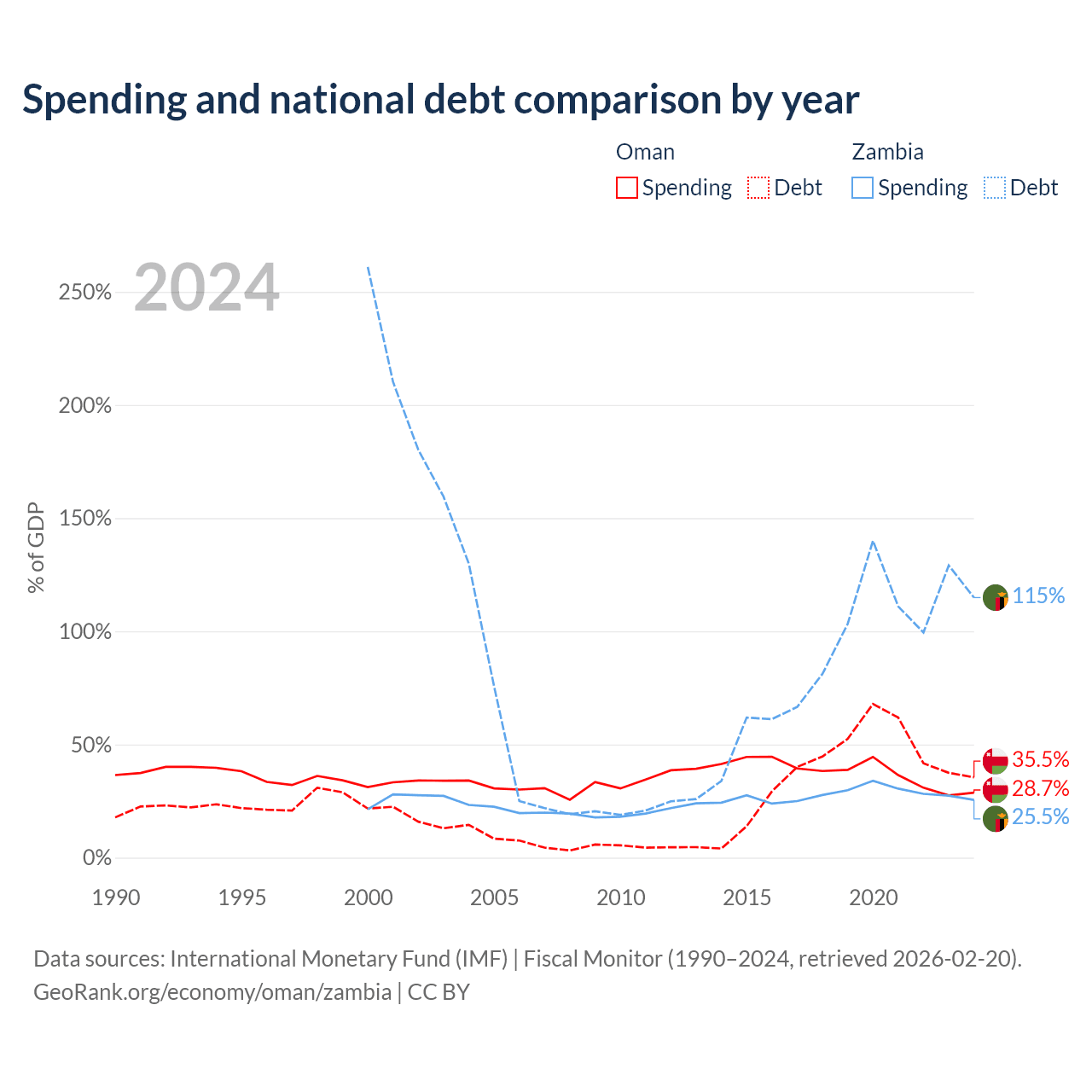 Oman has $38B in government debt (35.5% of GDP), compared to $29.1B (114.9% of GDP) in Zambia.