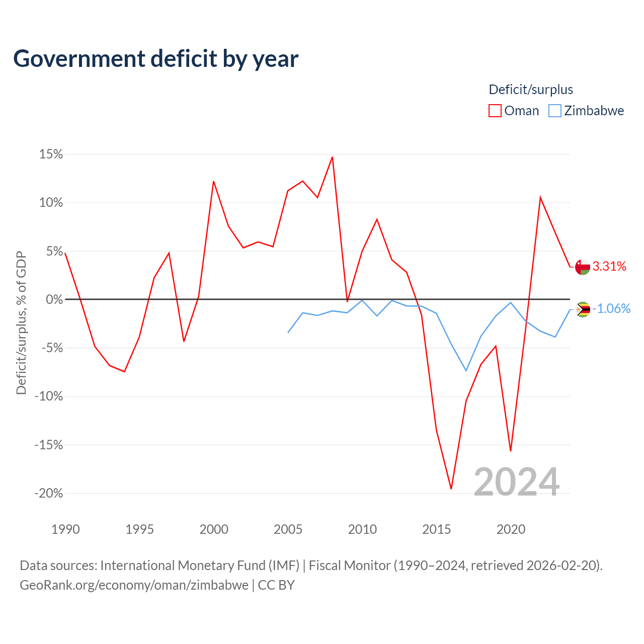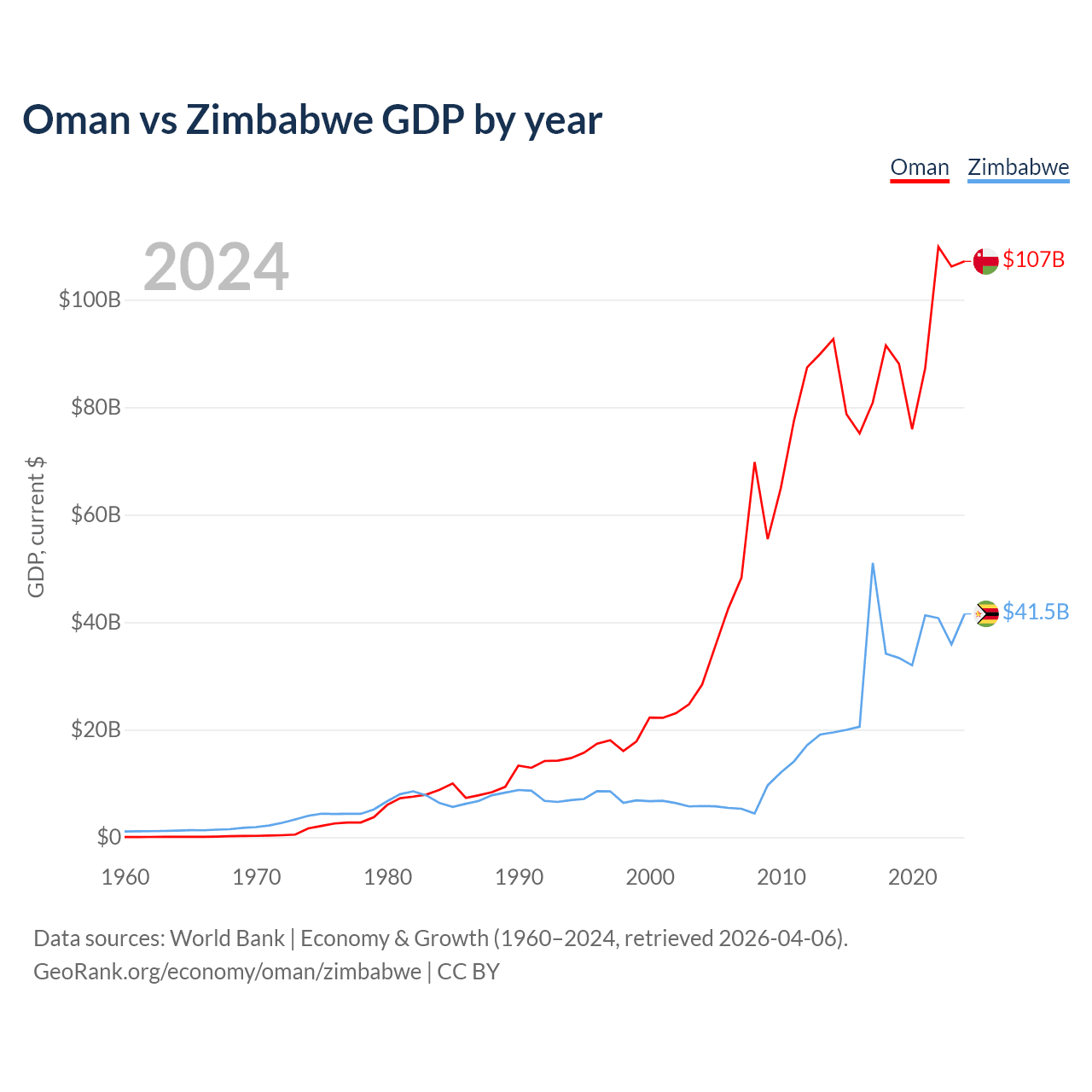 Oman has a GDP of $107B compared to $41.5B for Zimbabwe, ranking 70/197 and 102/197 by economy size, respectively.