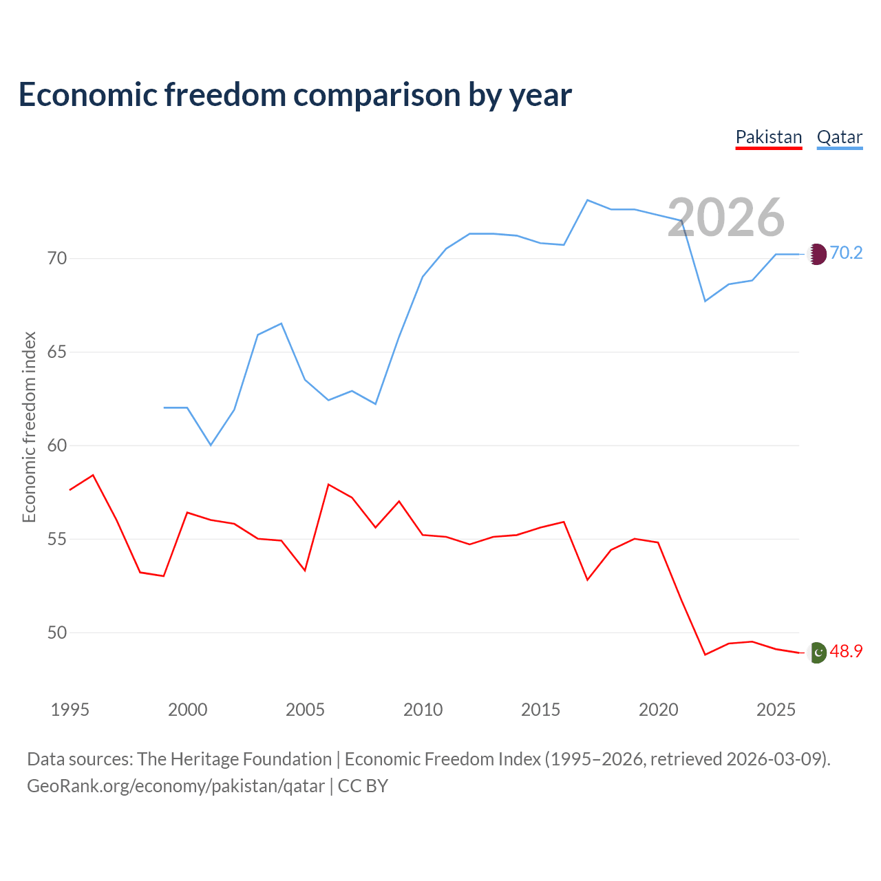 The Economic Freedom Index for Pakistan is 48.9, ranking 168/197, compared to 70.2 for Qatar, ranking 37/197. The chart above displays a comparison of annual changes in economic freedom indexes.