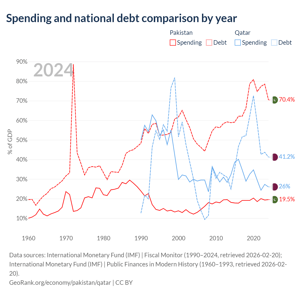 Pakistan has $262B in government debt (70.4% of GDP), compared to $90.2B (41.2% of GDP) in Qatar.