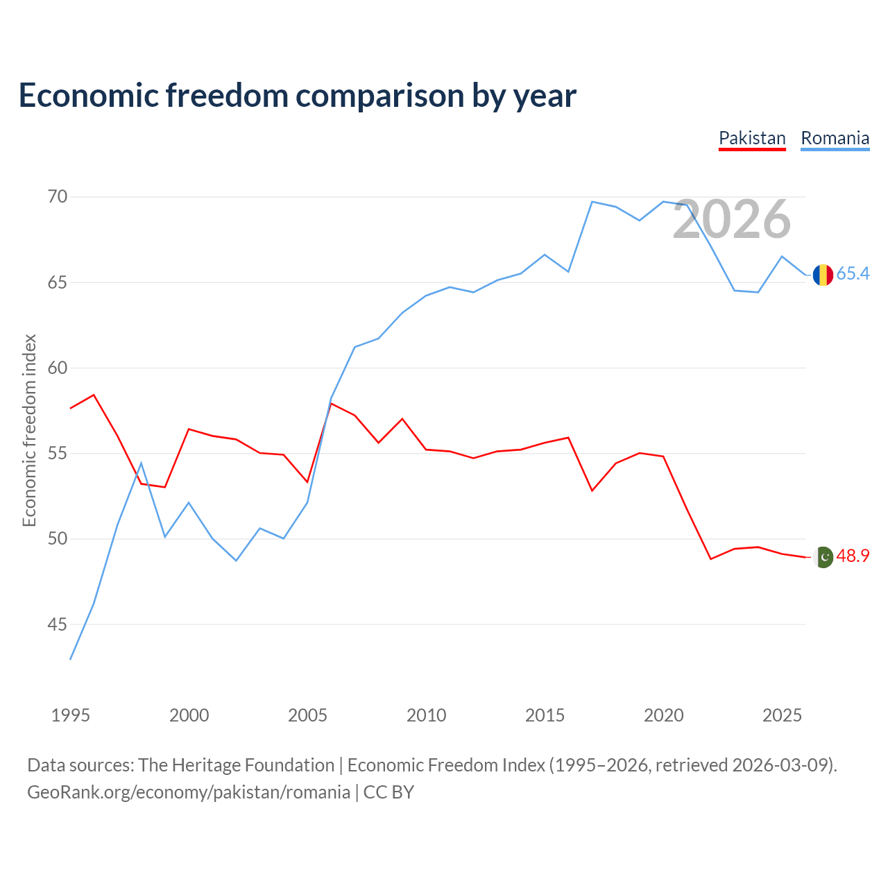The Economic Freedom Index for Pakistan is 48.9, ranking 168/197, compared to 65.4 for Romania, ranking 64/197. The chart above displays a comparison of annual changes in economic freedom indexes.