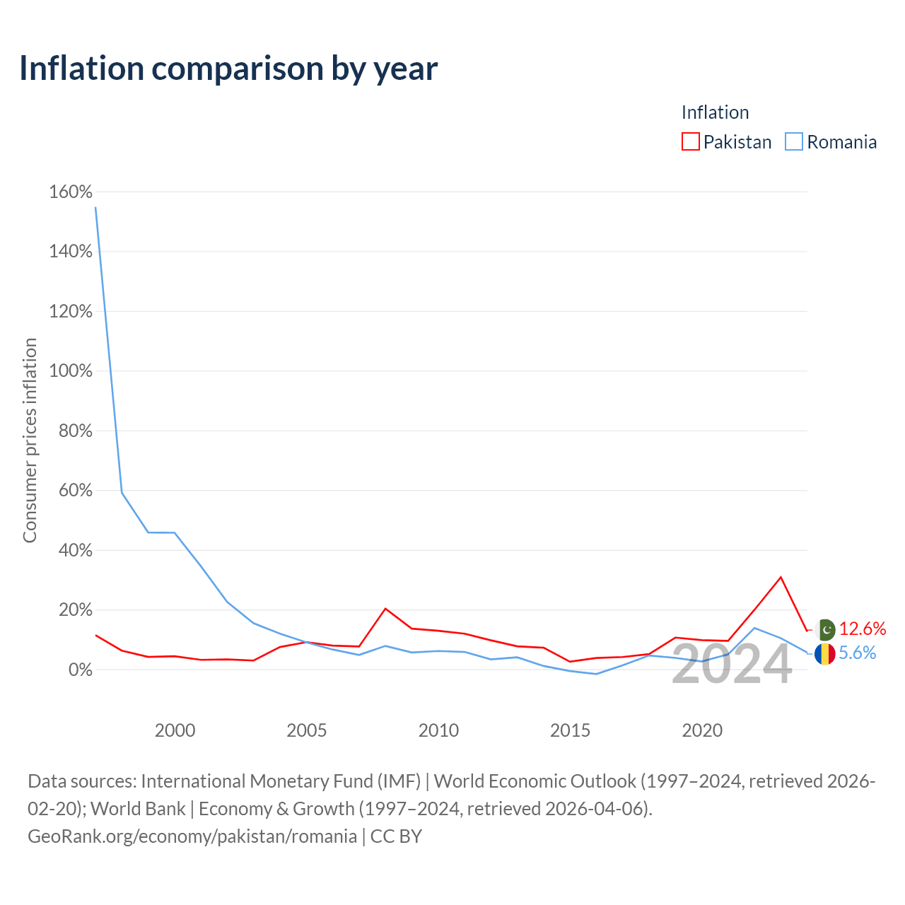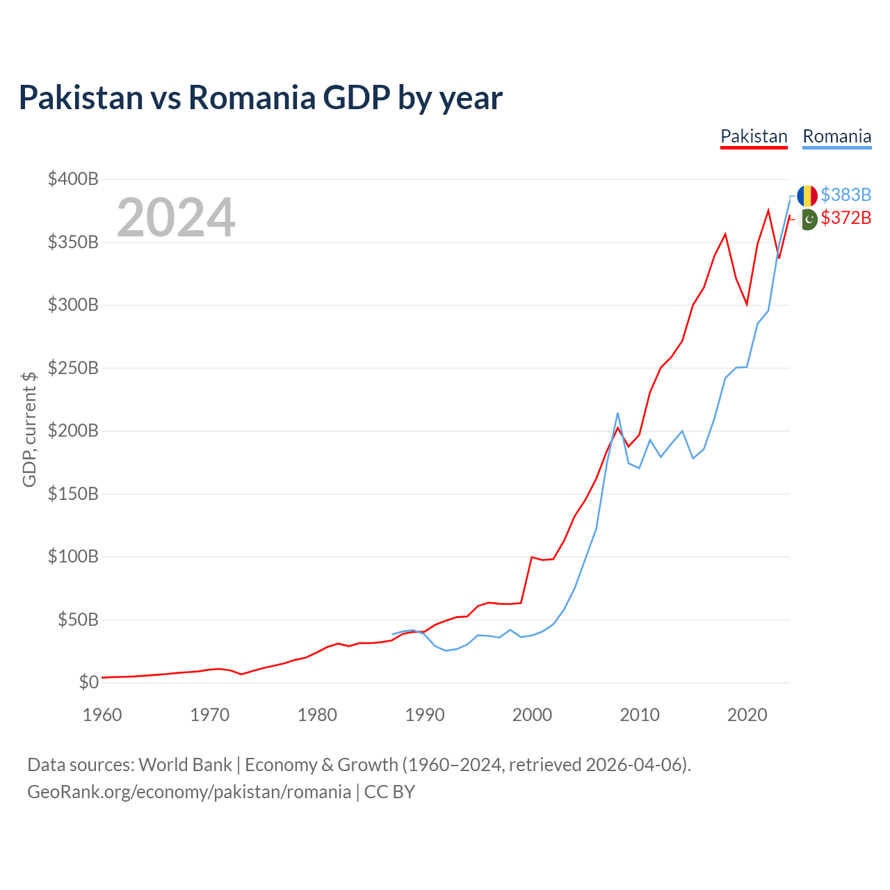 Pakistan has a GDP of $372B compared to $383B for Romania, ranking 43/197 and 42/197 by economy size, respectively.