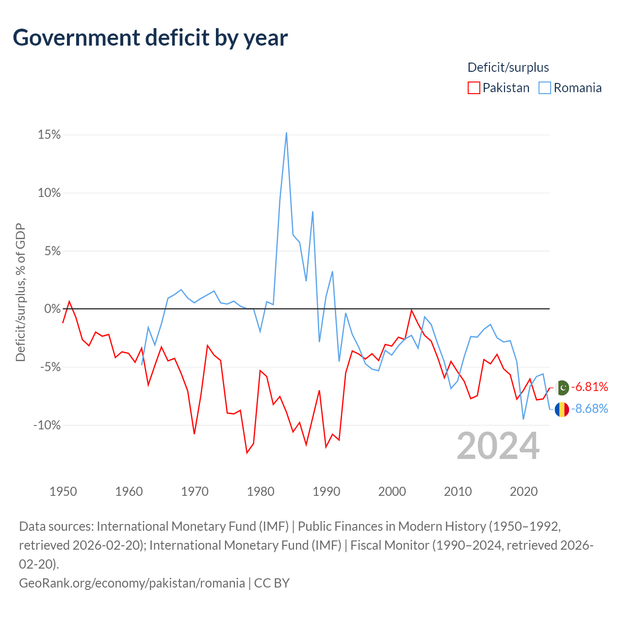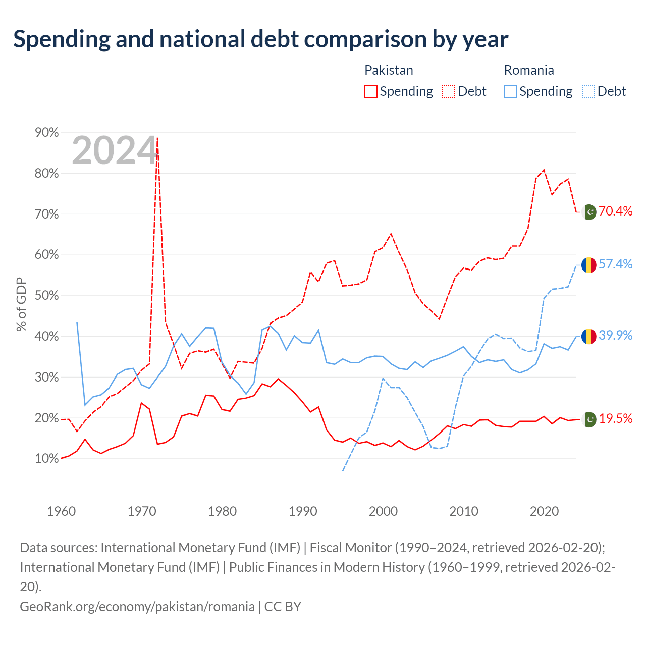 Pakistan has $262B in government debt (70.4% of GDP), compared to $220B (57.4% of GDP) in Romania.