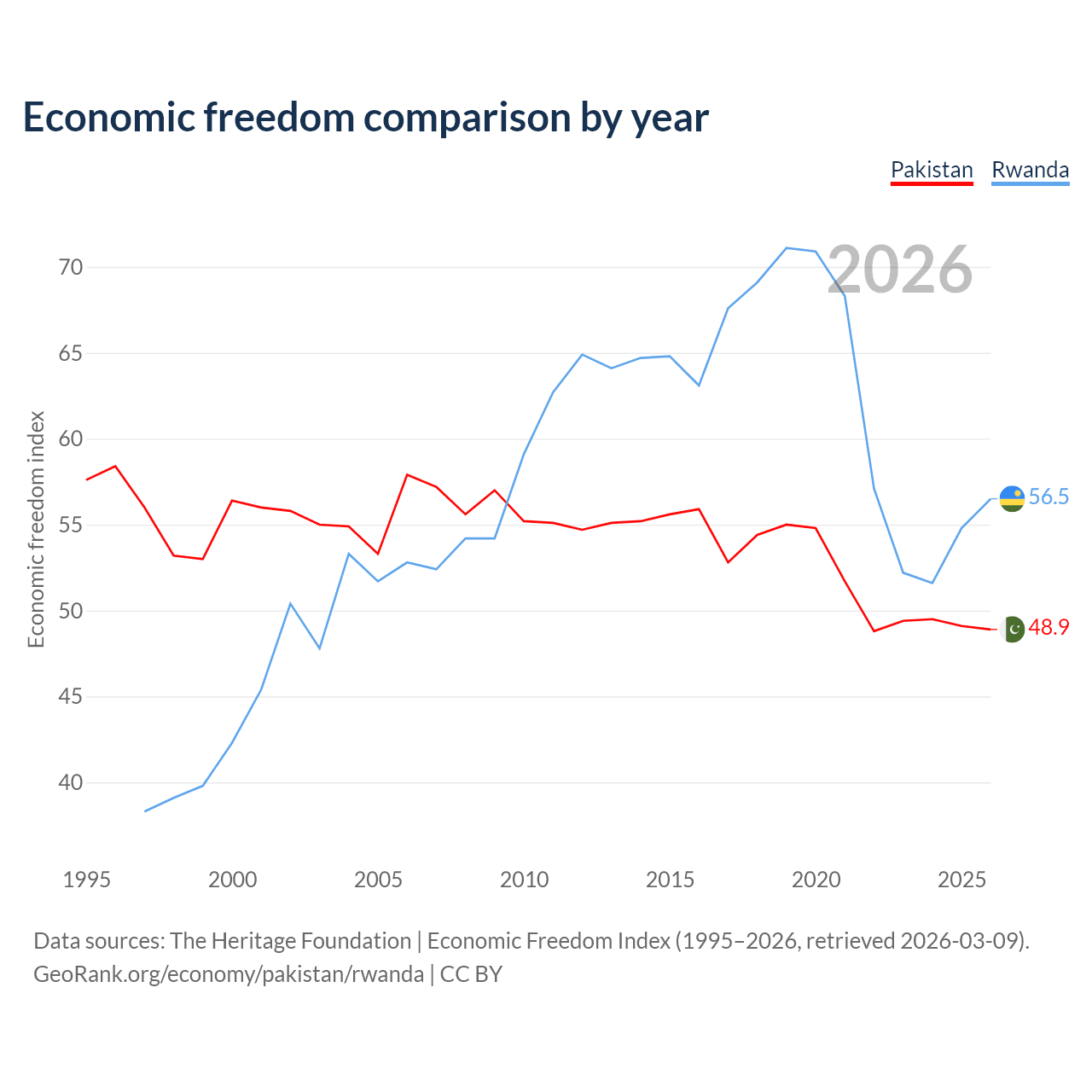 The Economic Freedom Index for Pakistan is 48.9, ranking 168/197, compared to 56.5 for Rwanda, ranking 121/197. The chart above displays a comparison of annual changes in economic freedom indexes.