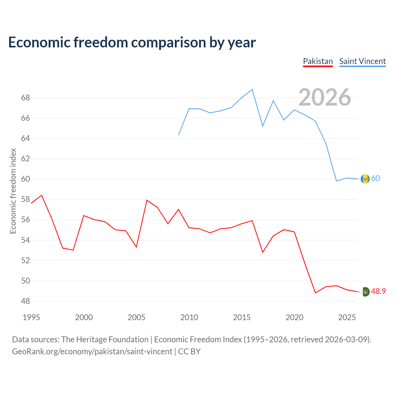 The Economic Freedom Index for Pakistan is 48.9, ranking 168/197, compared to 60 for Saint Vincent, ranking 98/197. The chart above displays a comparison of annual changes in economic freedom indexes.