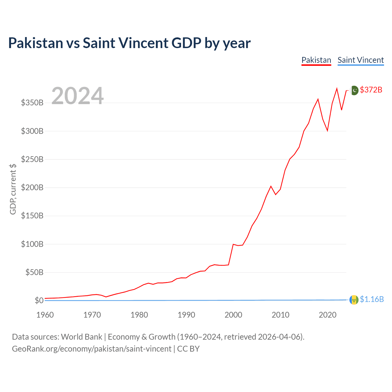 Pakistan has a GDP of $372B compared to $1.16B for Saint Vincent, ranking 43/197 and 186/197 by economy size, respectively.