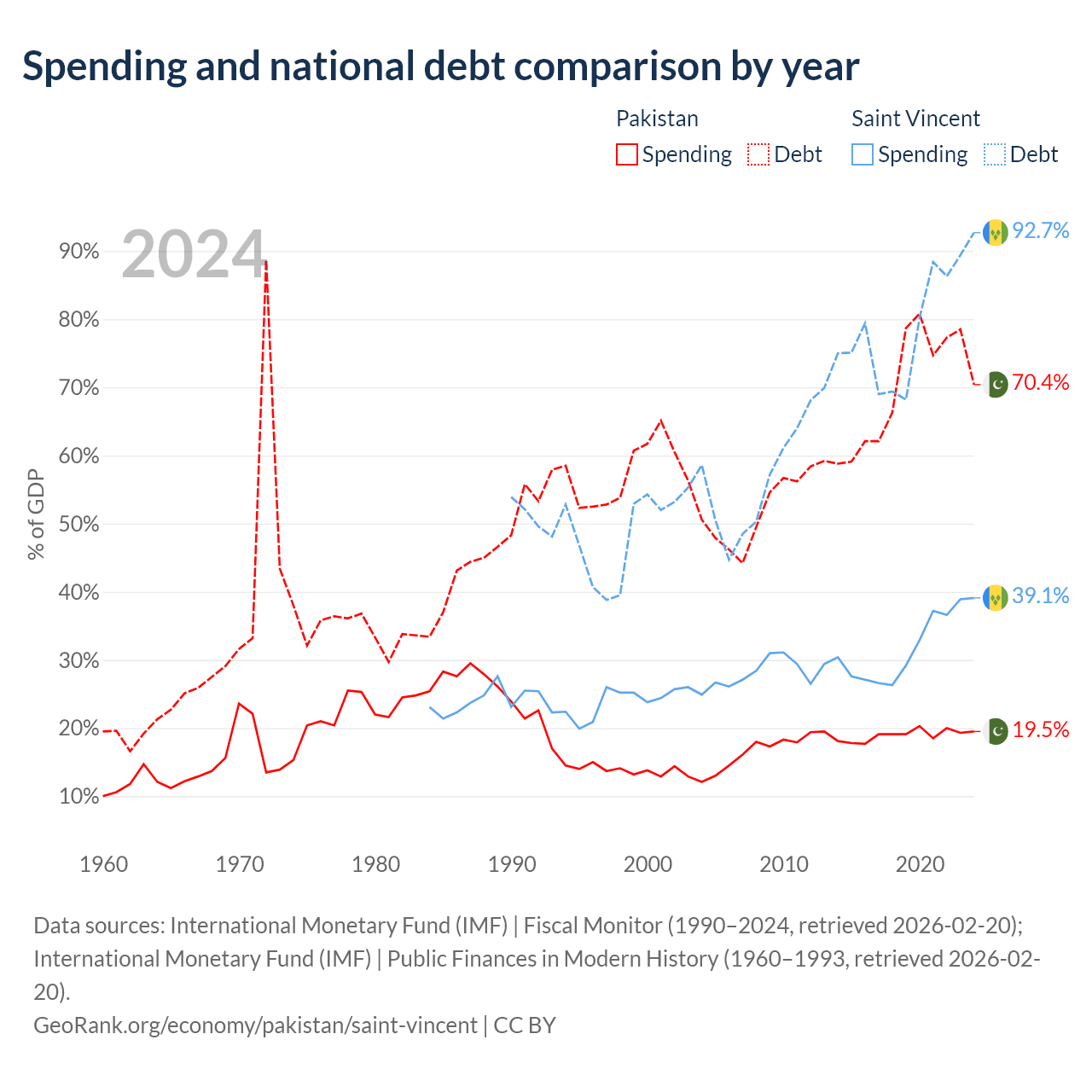 Pakistan has $262B in government debt (70.4% of GDP), compared to $1.07B (92.7% of GDP) in Saint Vincent.