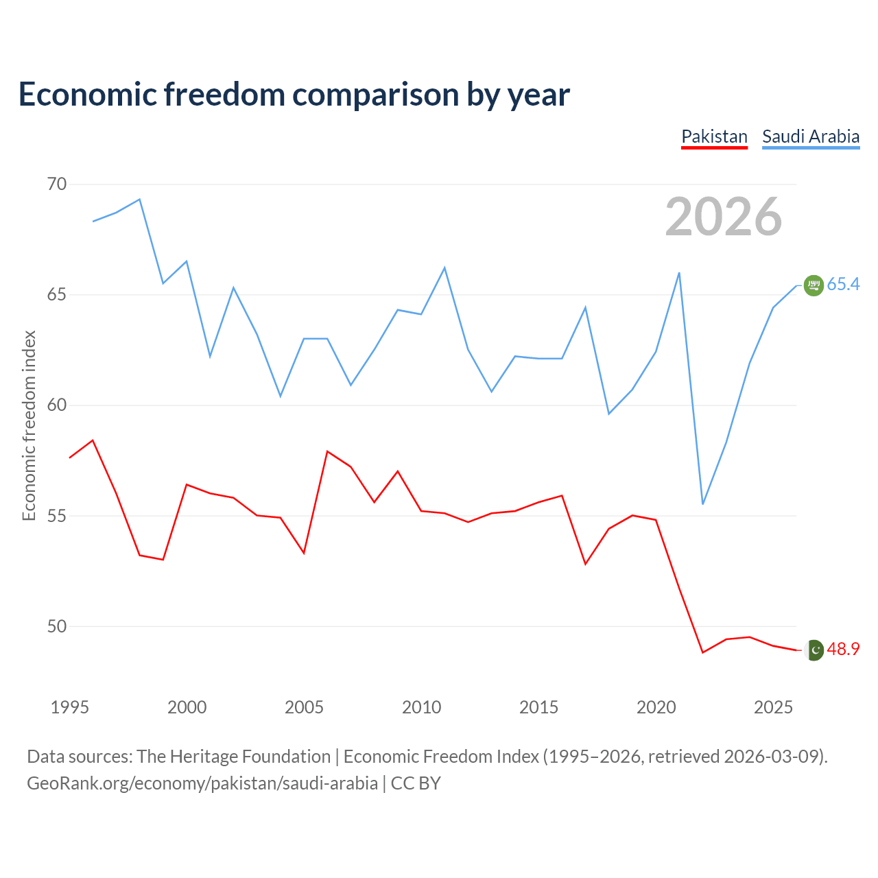 The Economic Freedom Index for Pakistan is 48.9, ranking 168/197, compared to 65.4 for Saudi Arabia, ranking 65/197. The chart above displays a comparison of annual changes in economic freedom indexes.