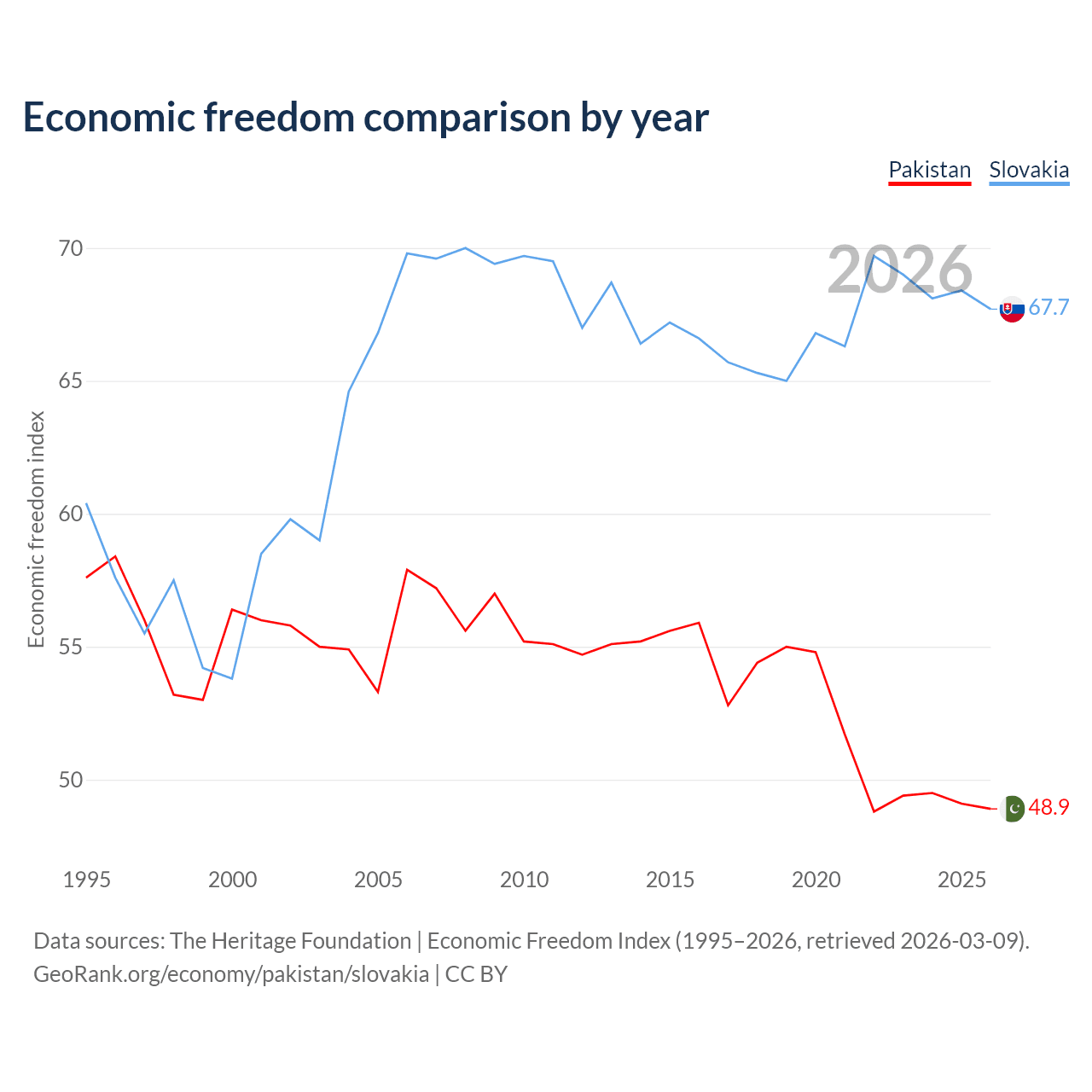 The Economic Freedom Index for Pakistan is 48.9, ranking 168/197, compared to 67.7 for Slovakia, ranking 54/197. The chart above displays a comparison of annual changes in economic freedom indexes.