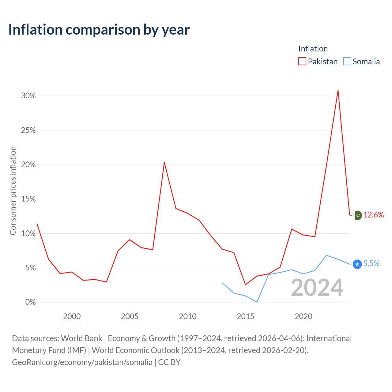 Pakistan has a GDP of $372B compared to $12B for Somalia, ranking 43/197 and 150/197 by economy size, respectively.