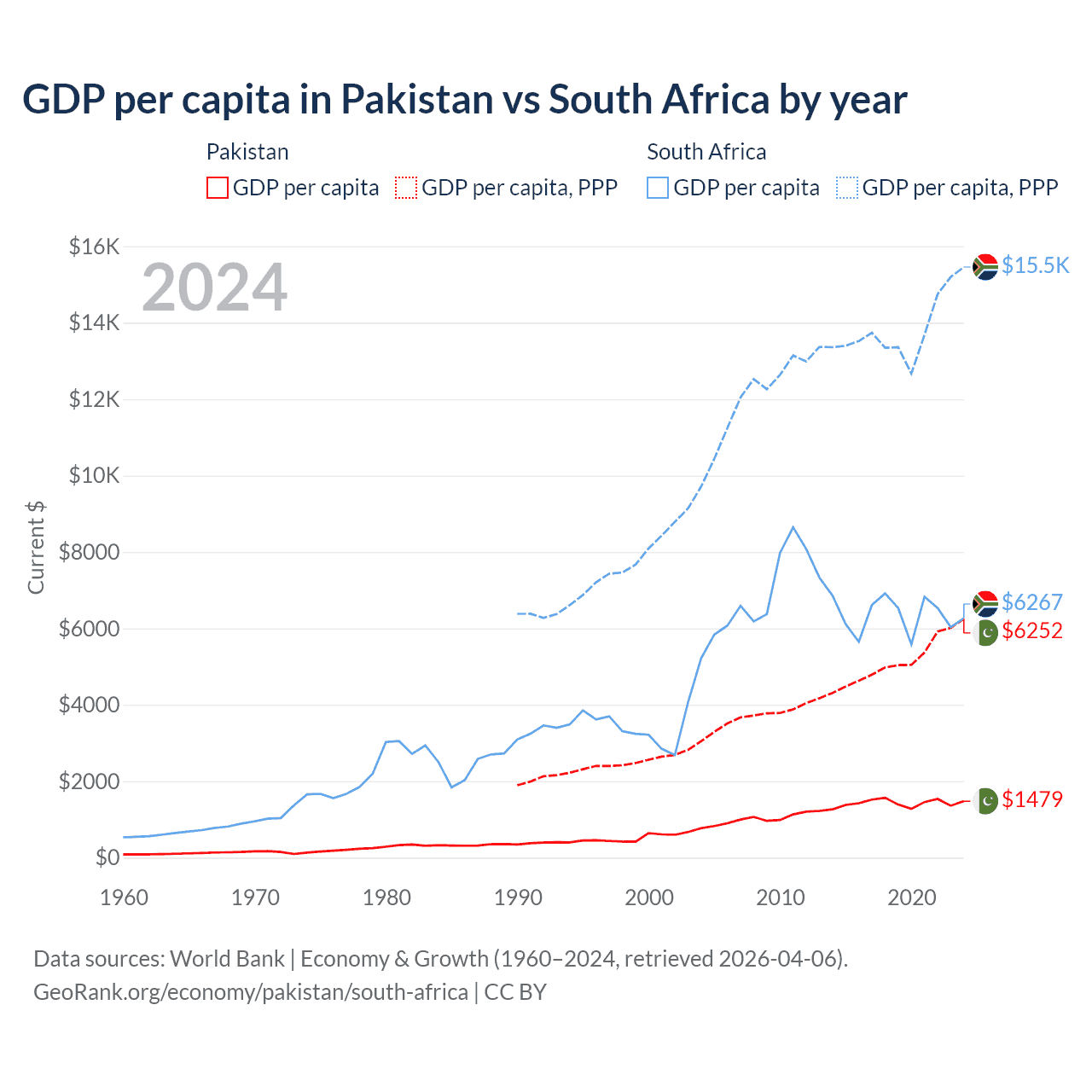 GDP per capita in Pakistan vs South Africa by year