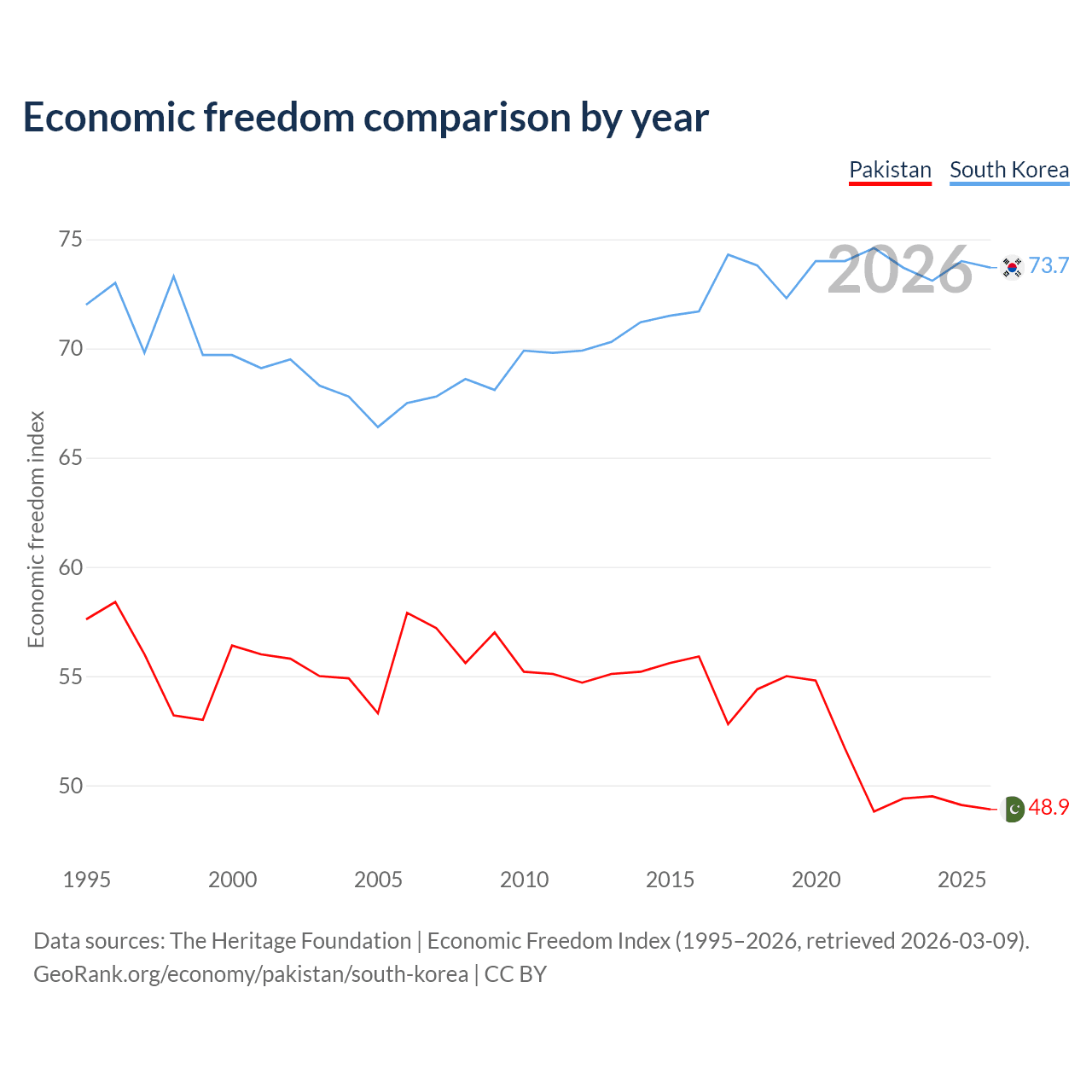 The Economic Freedom Index for Pakistan is 48.9, ranking 168/197, compared to 73.7 for South Korea, ranking 24/197. The chart above displays a comparison of annual changes in economic freedom indexes.